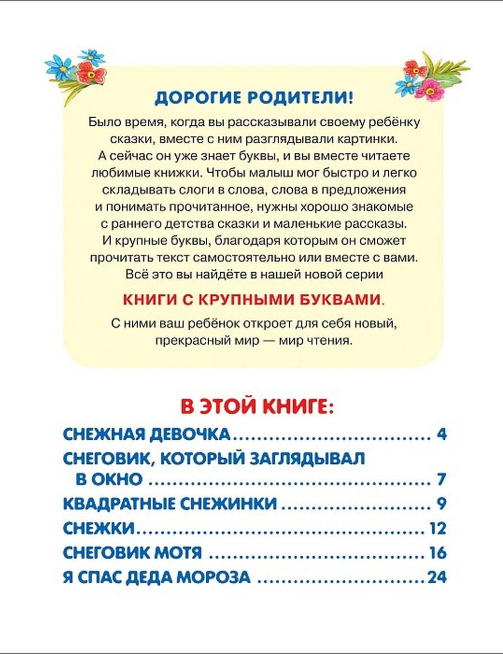 «Книги с крупными буквами» - это специально разработанная серия для детей, которые только начинают учиться читать. Крупный шрифт и давно знакомые произведения помогут детям легко и быстро складывать слоги в слова, составлять предложения и понимать прочитанное.
