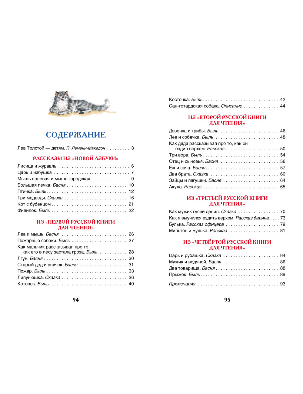 В сборник вошли произведения Л.Н.Толстого разнообразного жанра из "Новой азбуки" и серии из четырех "Русских книг для чтения": "Три медведя", "Липунюшка", "Косточка", "Лев и собачка", "Акула", "Два брата", "Прыжок" и др. Они созданы в начале 1870-х гг. для учеников школы, организованной Толстым в Ясной Поляне, и любимы многими поколениями детей.