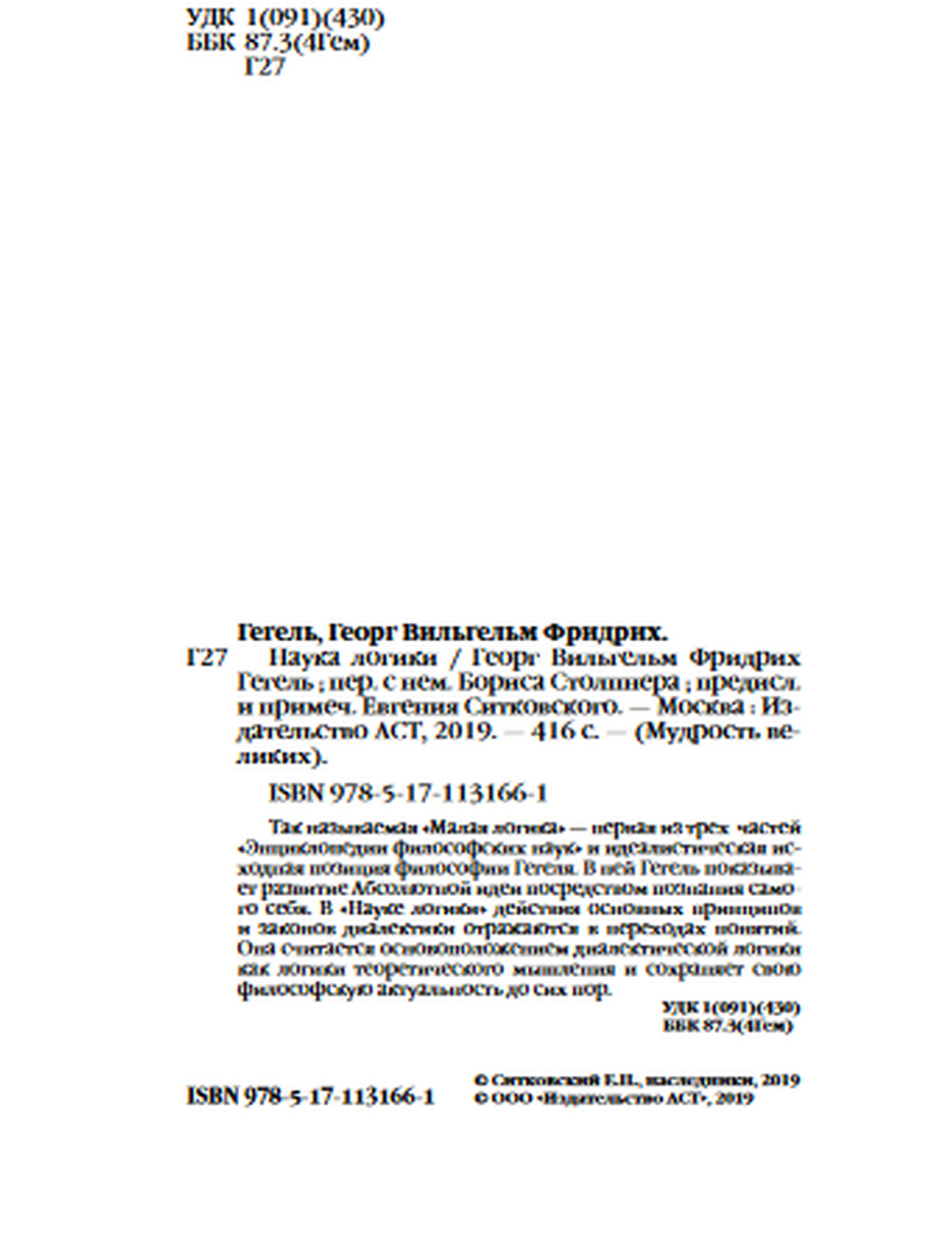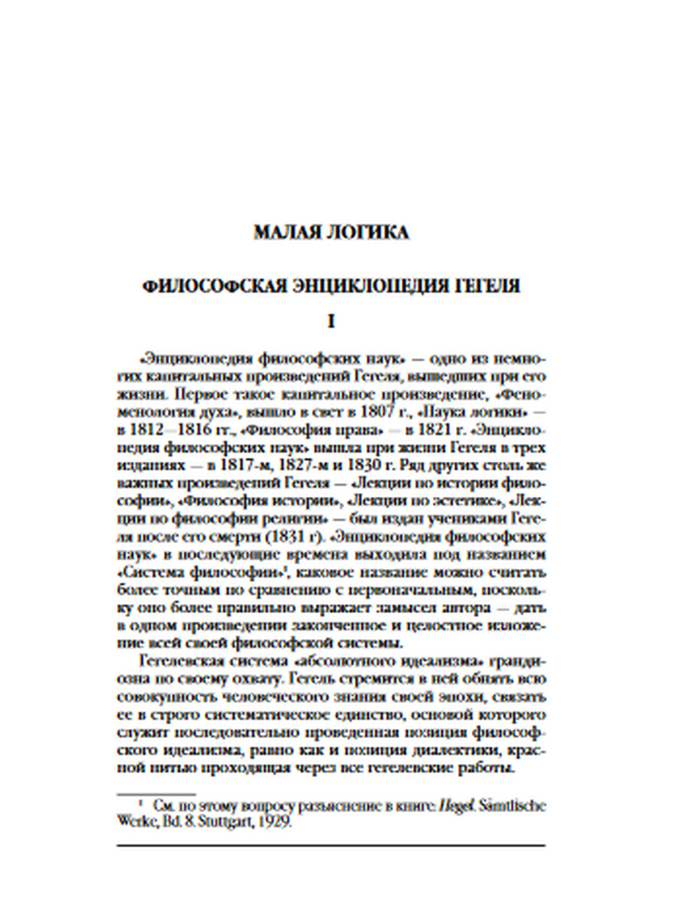 Так называемая "Малая логика" – первая из трех частей "Энциклопедии философских наук" и идеалистическая исходная позиция философии Гегеля. В ней Гегель показывает развитие Абсолютной идеи посредством познания самого себя. В "Науке логики" действия основных принципов и законов диалектики отражаются в переходах понятий. Она считается основоположением диалектической логики как логики теоретического мышления и сохраняет свою философскую актуальность до сих пор.