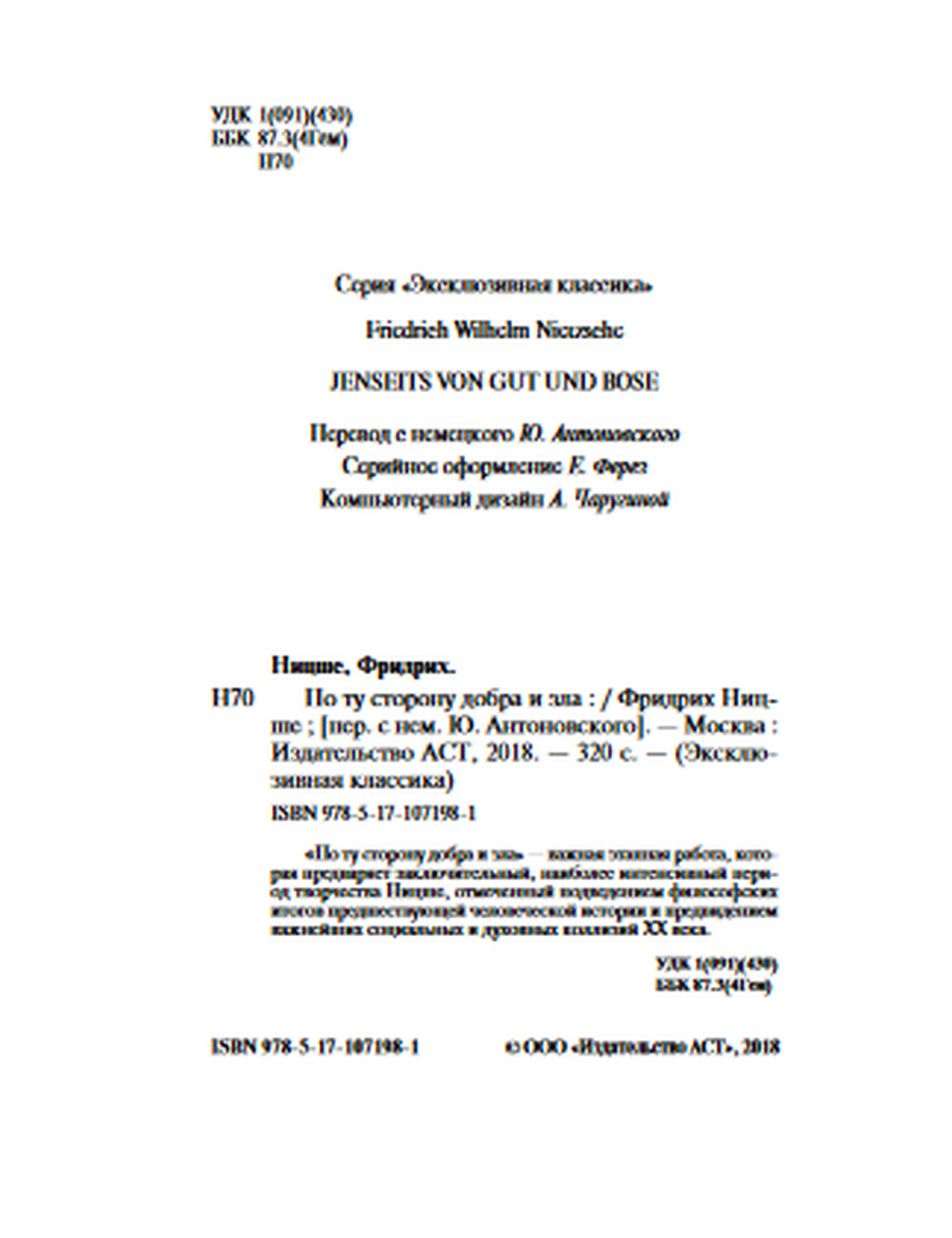 «По ту сторону добра и зла» – важная этапная работа, которая предваряет заключительный, наиболее интенсивный период творчества Ницше, отмеченный подведением философских итогов предшествующей человеческой истории и предвидением важнейших социальных и духовных коллизий XX века.