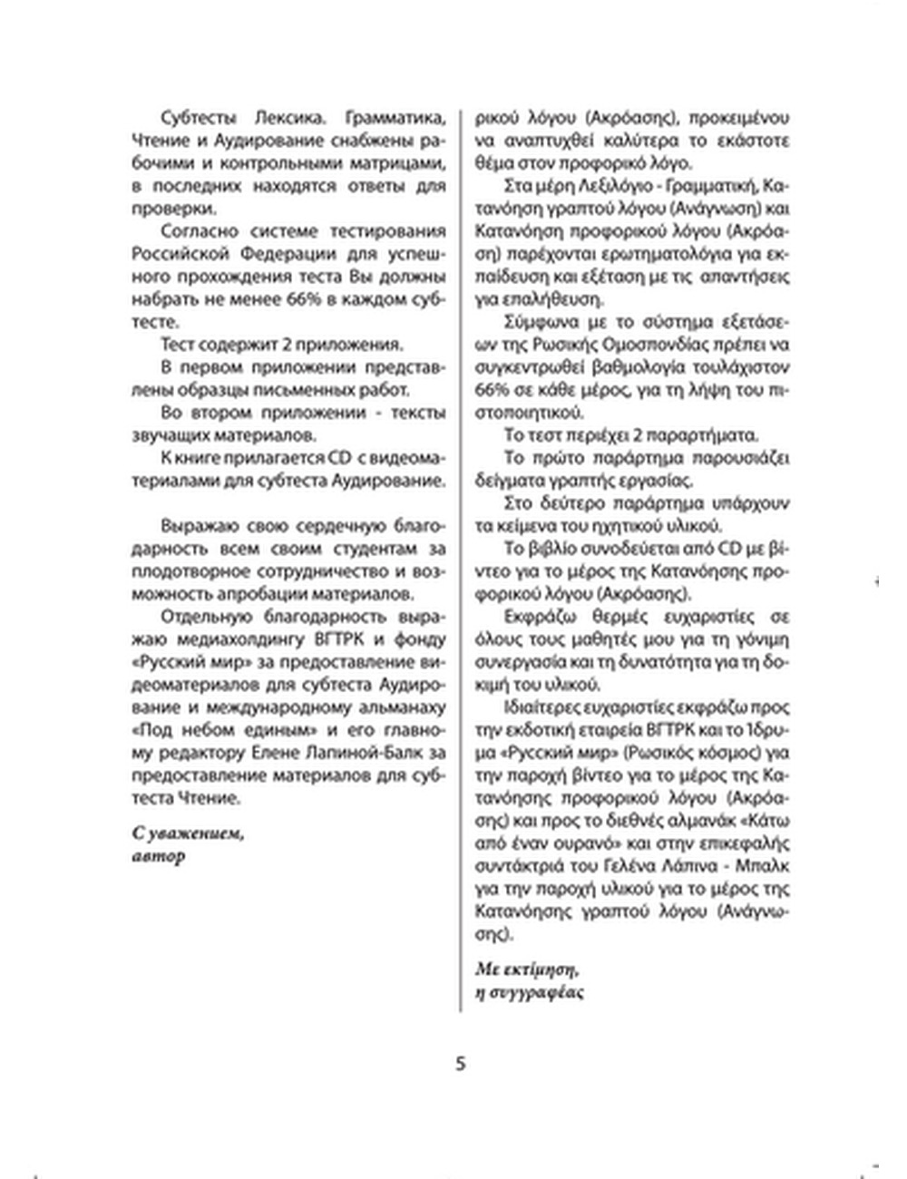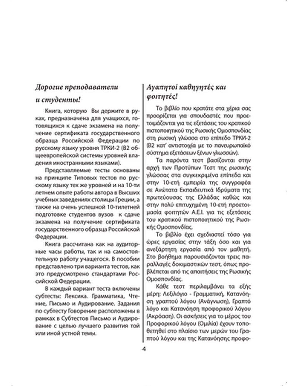 Книга рекомендована учащимся, готовящимся к сдаче экзамена на получение сертификата государственного образца Российской Федерации по русскому языку уровня ТРКИ-2 (В2 общеевропейской системы уровней владения иностранными языками), преподавателям русского языка как иностранного, работающим как в Греции, так и за рубежом, а также всем интересующимся изучением русского языка.