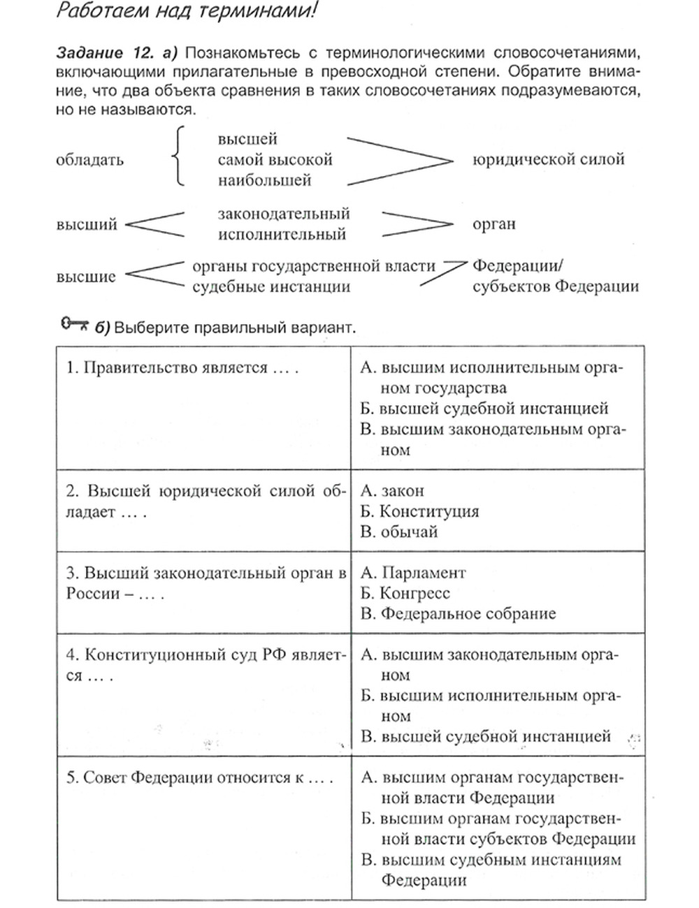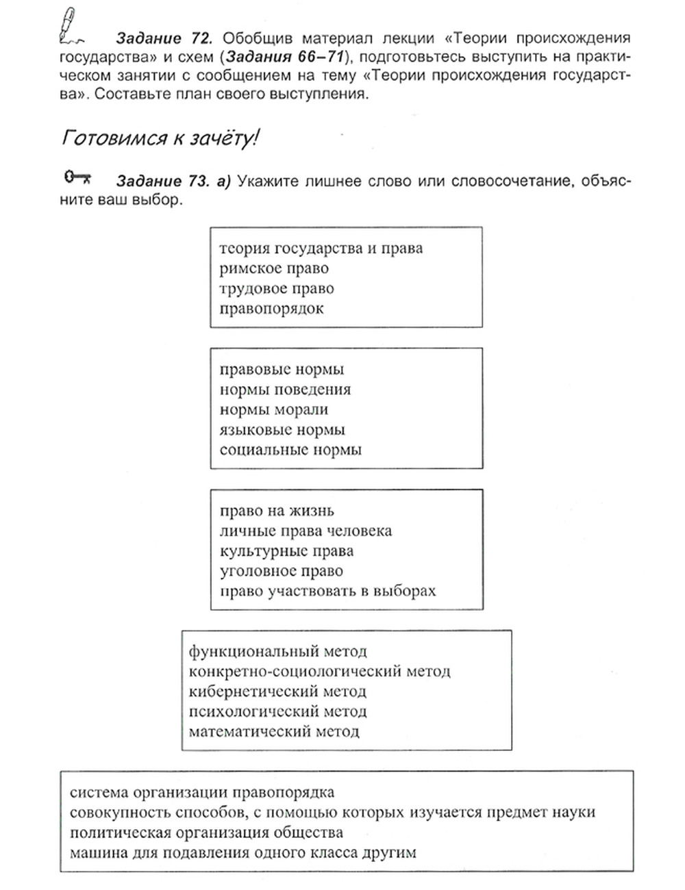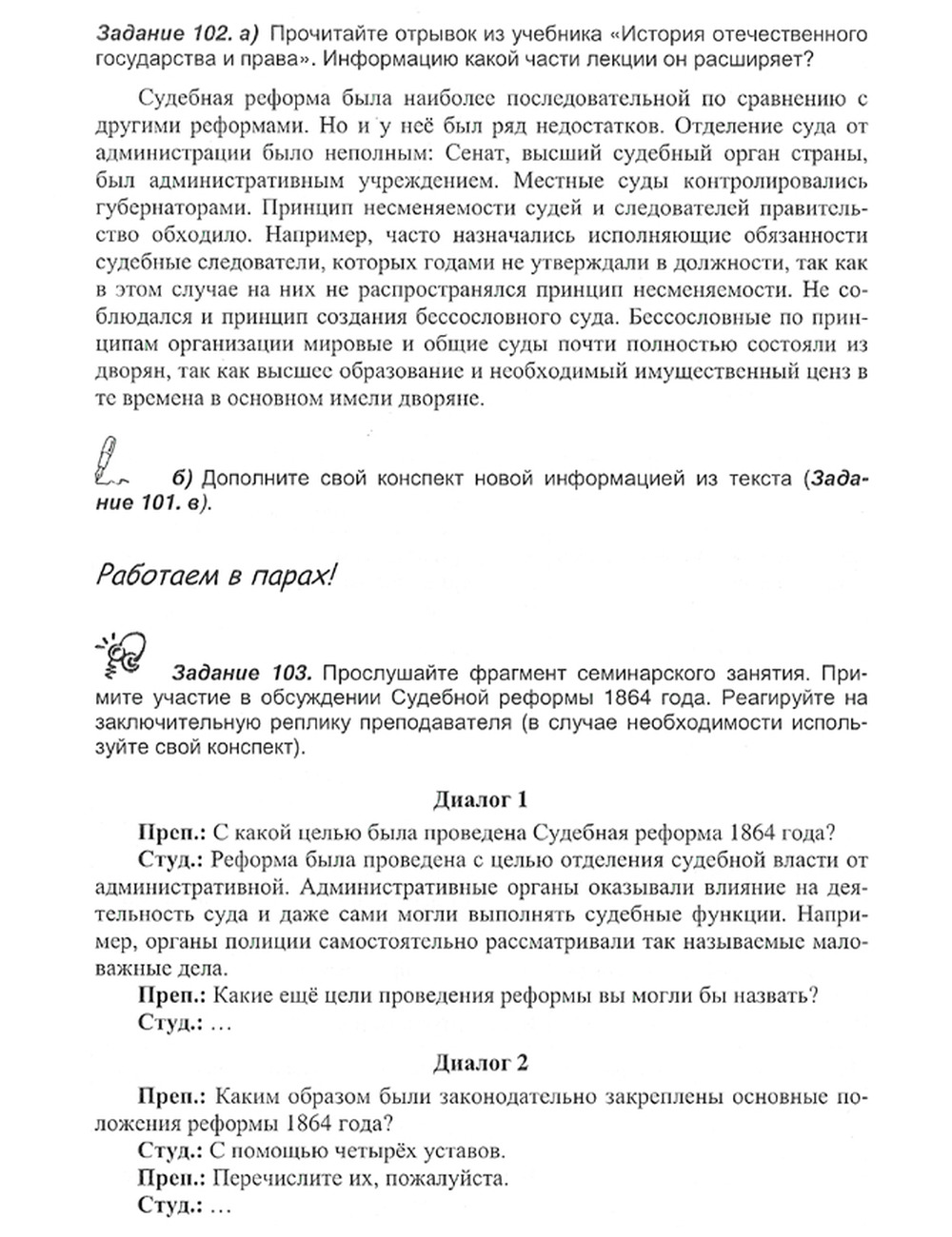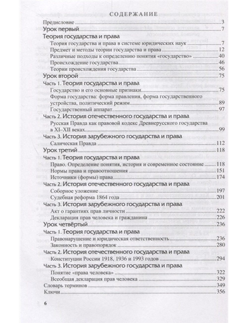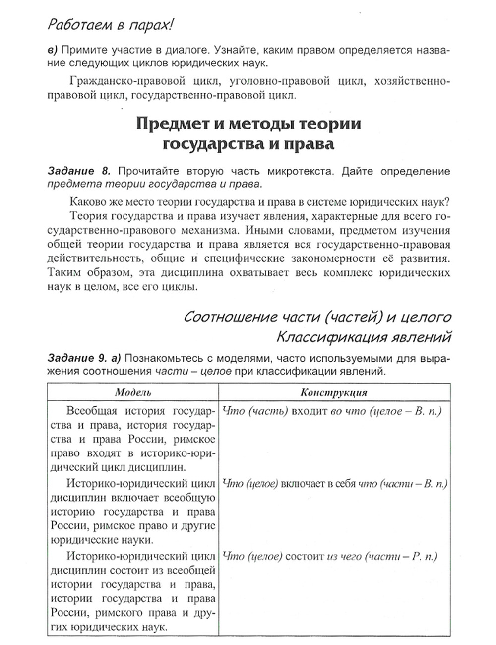 владеющим русским языком в объеме первого сертификационного уровня. Основная цель пособия — формирование у студентов коммуникативной компетенции, достаточной для адекватного профессионального общения в учебно-научной сфере их деятельности. Пособие создано в соответствии с новыми образовательными стандартами и с учетом последних достижений коммуникативной методики преподавания русского языка как иностранного: особое внимание уделяется комплексному развитию речевых умений в четырёх видах речевой деятельности, включая устную научную речь (говорение и аудирование), как монологическую, так и диалогическую. Отличительной чертой пособия является ориентация текстового материала, лежащего в его основе, на три основных специальных курса: «Теория государства и права», «Всеобщая история государства и права», «История отечественного государства и права».