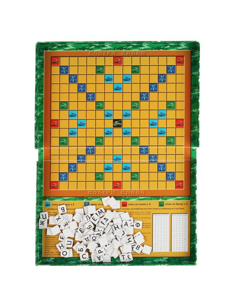Комплектация: коробка с игровым полем 290х405 мм, 125 фишек (118 – с буквами, 3 джокера и 4 запасные).