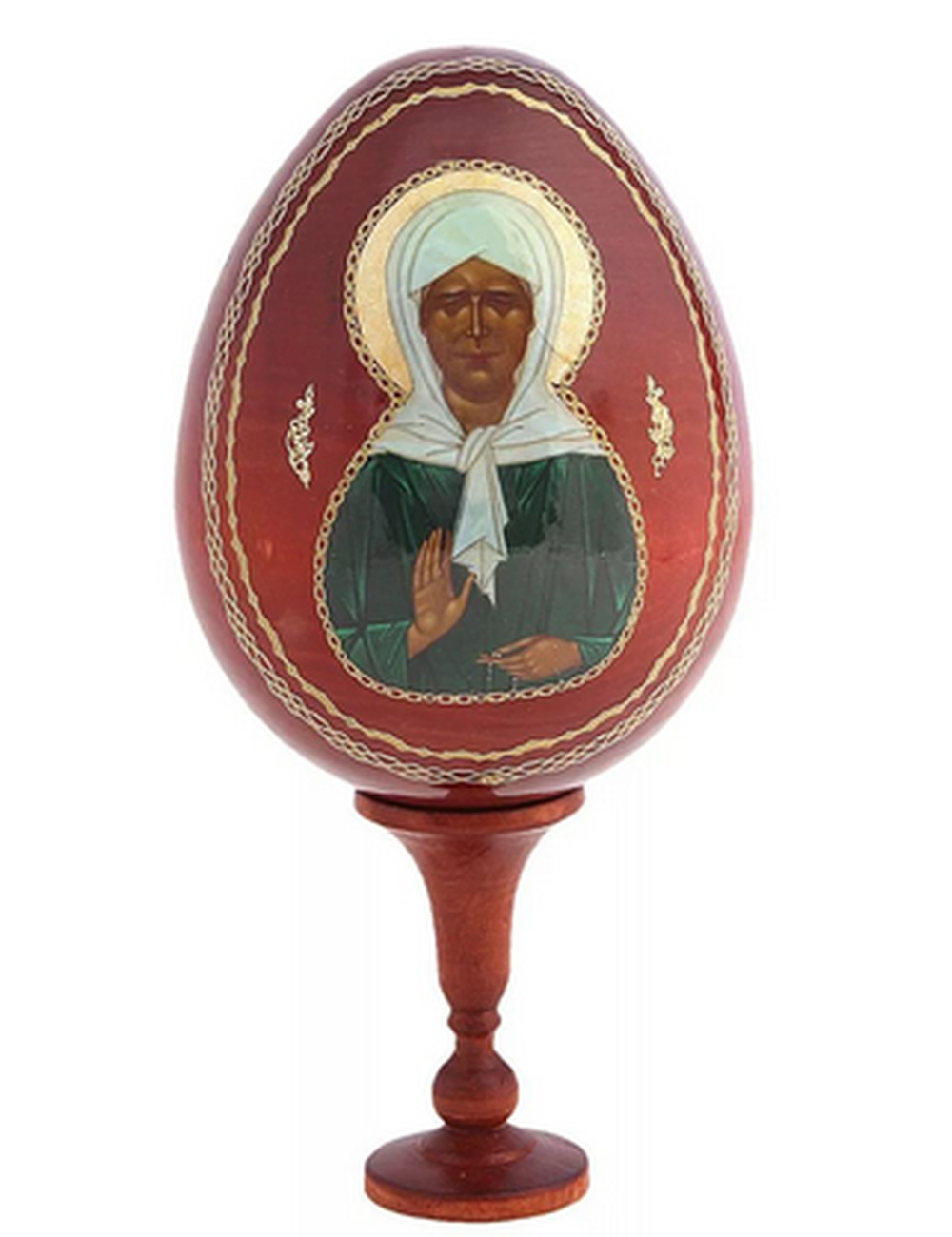 Декоративное яйцо "Матрона Московская" изготовлено из дерева с лаковым покрытием. Яйцо оформлено изображением иконы "Матрона Московская" и золотыми узорами. Изделие располагается на деревянной подставке.