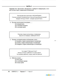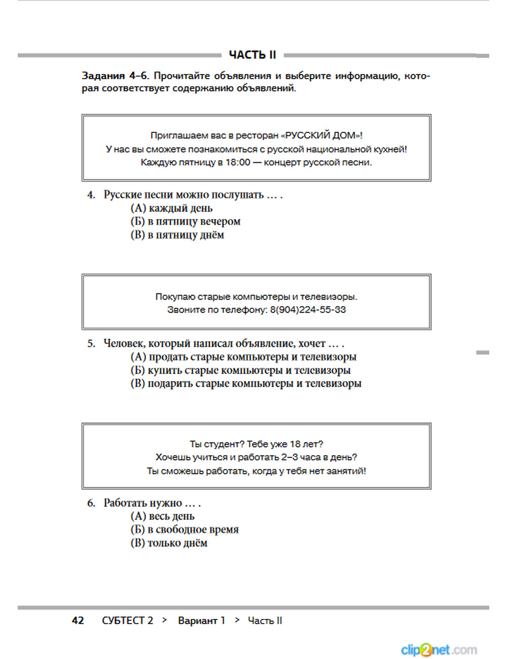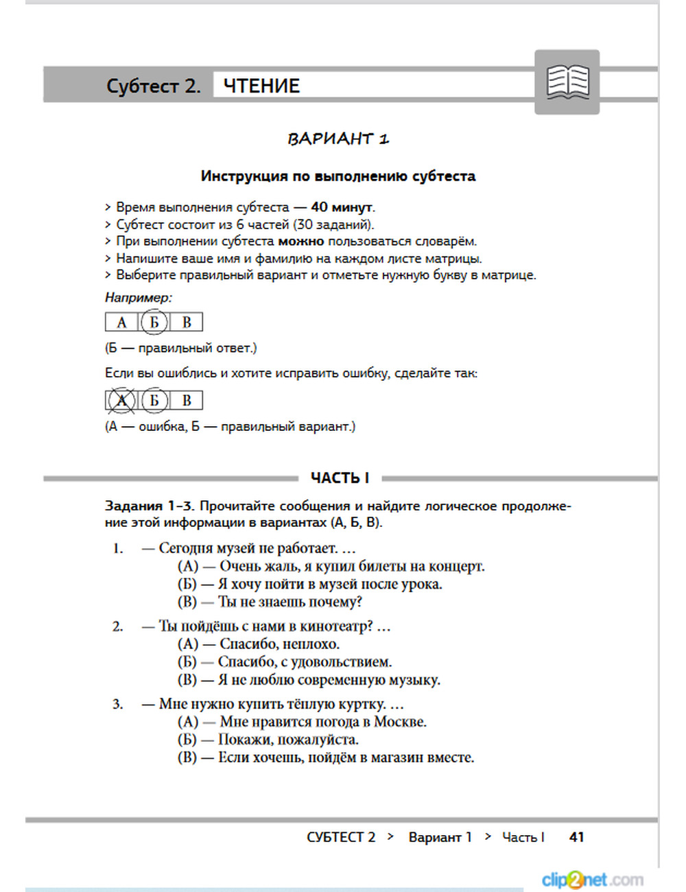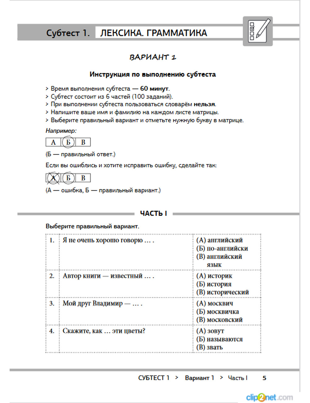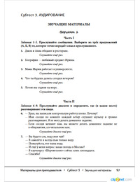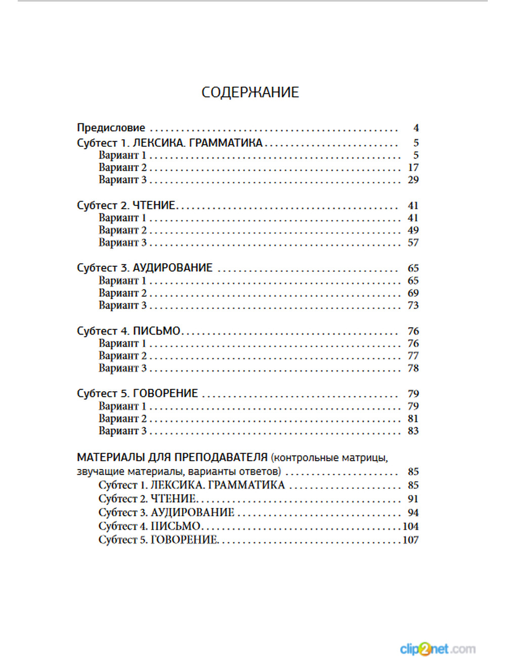 Задания субтестов «Лексика. Грамматика», «Чтение» и «Аудирование» снабжены рабочими и контрольными матрицами. Задания субтестов «Письмо» и «Говорение» снабжены вариантами ответов.