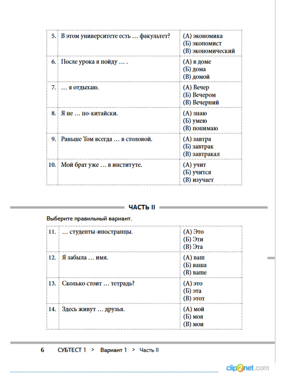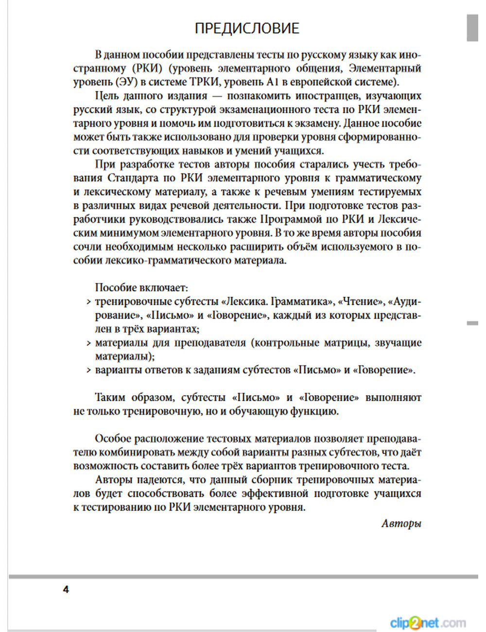 Тесты предназначены для подготовки иностранных учащихся ксдаче экзамена по русскому языку как иностранному (элементарный уровень). Структура и содержание сборника позволяют работать с ним как под руководством преподавателя, так и самостоятельно.