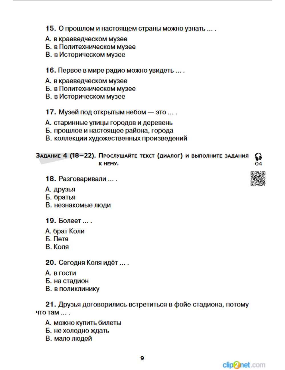 Тренировочные тесты по русскому языку как иностранному адресованы всем, кто, изучая русский язык, прошёл программу I сертификационного уровня и хочет подготовиться к сдаче тестов. Данное пособие можно использовать как при работе в аудитории с преподавателем, так и при самостоятельной подготовке к сдаче экзамена. Оно может быть использовано и в процессе обучения, и в качестве материалов текущего и итогового контроля. Предъявляемые в пособии материалы проходили апробацию в течение 3 лет в группах студентов-иностранцев, готовящихся к сдаче теста В1.