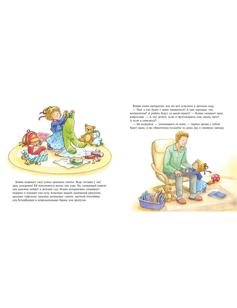 Все новое и неизвестное пугает ребенка, но с этой книгой ребенок точно не будет бояться первого дня в садике. Вместе с Конни малыш первый раз останется без мамы, проведет день в новом окружении и узнает, как разрешить деликатные ситуации — например, попроситься в туалет в незнакомом месте.