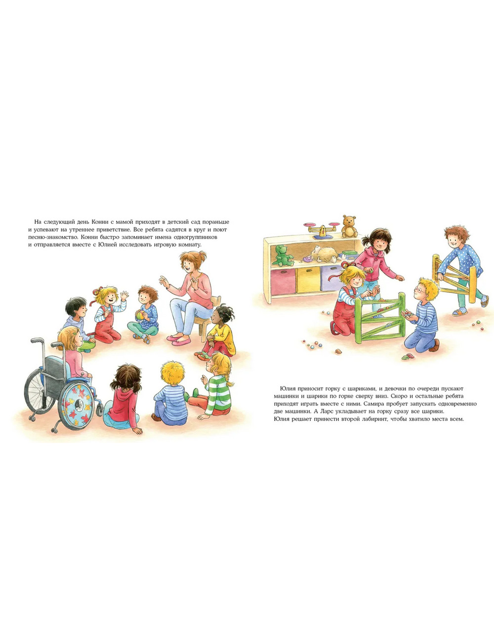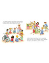 А яркие иллюстрации позволят маленьким слушателям детально представить события в детском саду — знакомство с воспитателем, завтраки, игры на детских площадках, празднования дня рождения и много другое.