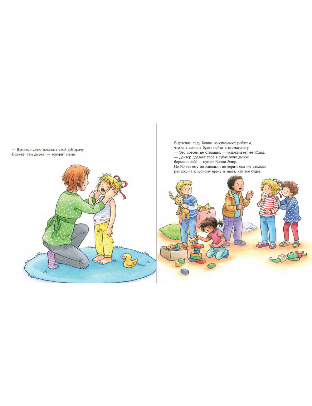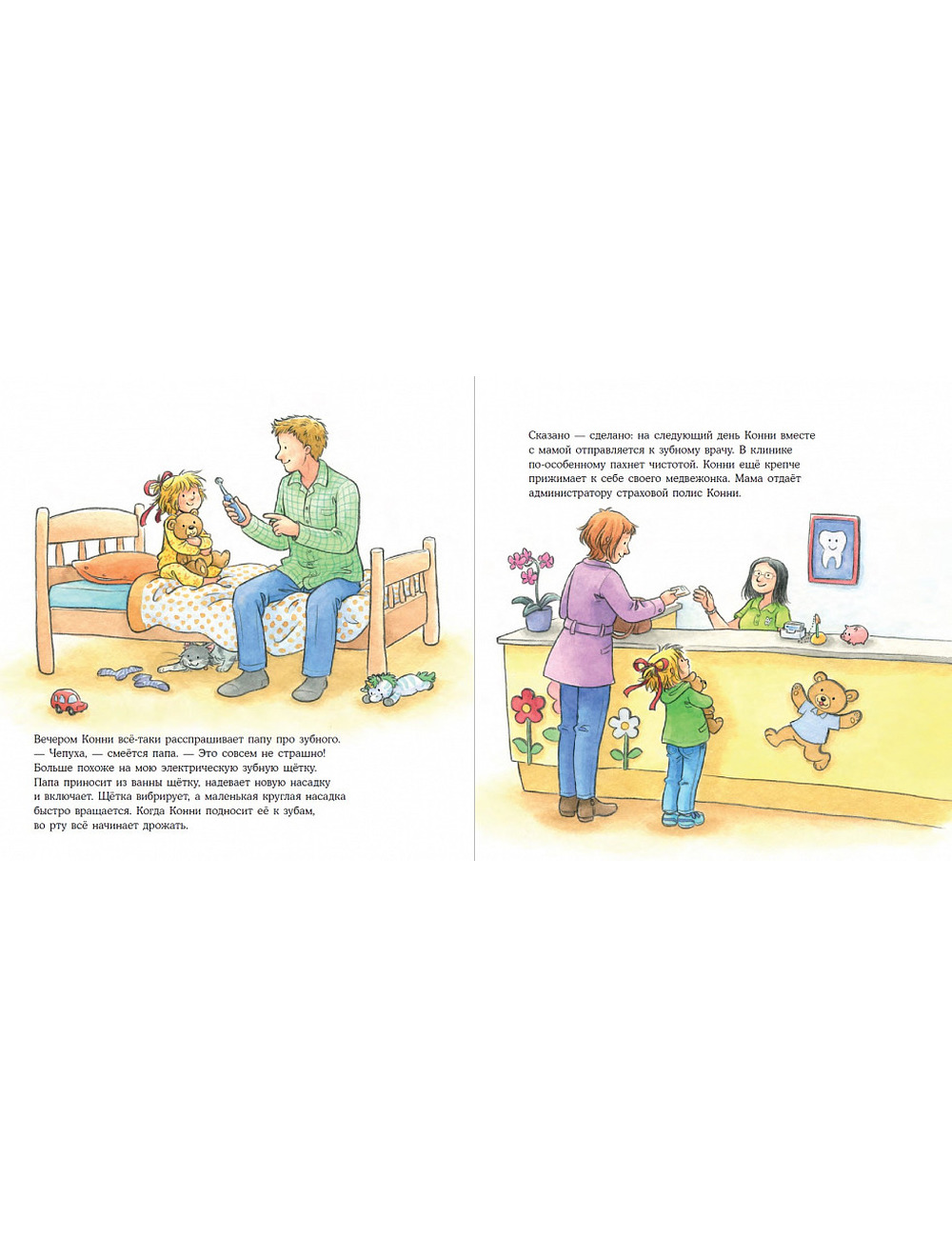 Изучили все иллюстрации? Предложите малышу рассказать, что происходит на картинках. Вот Конни лежит в кресле у зубного. Что делает врач? А её помощница? Как думаешь, Конни не больно?