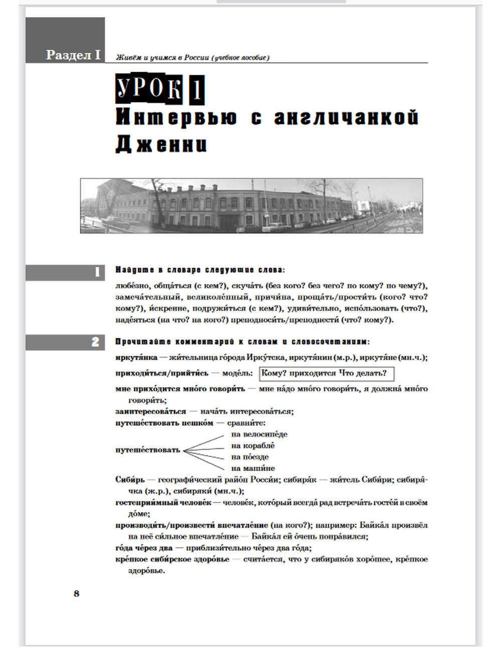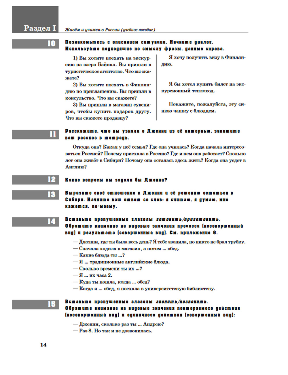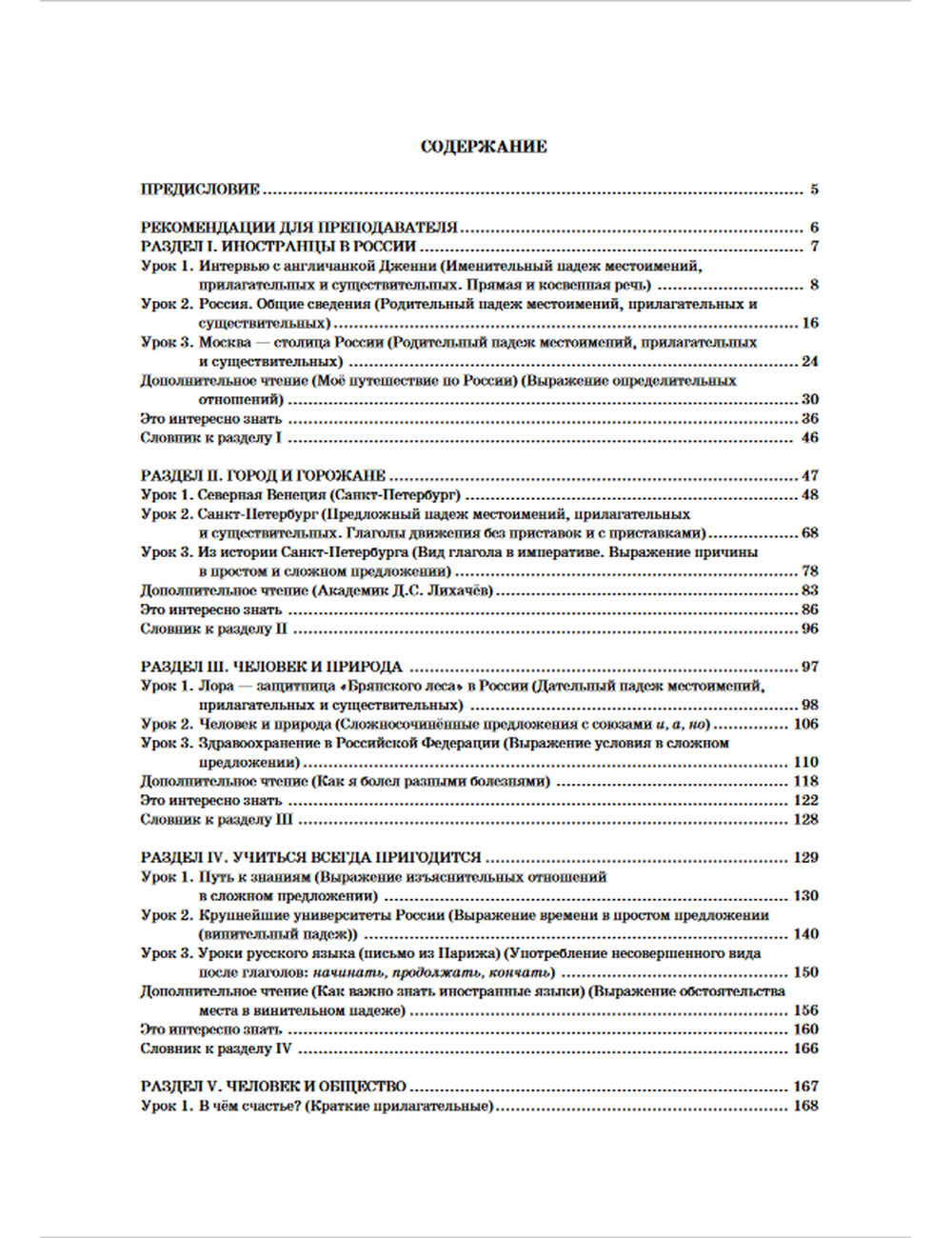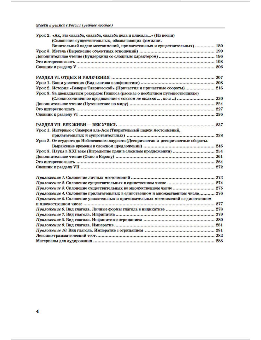 Учебник для взрослых, владеющих русским языком на базовом уровне (А2). Все формы обучения, в том числе система предвузовской подготовки (второй семестр). Обучает монологической и диалогической речи на примере текстов и полилогов разных стилей, развивает навыки чтения российской прессы, понимания теле и радиопередач. Готовит к сдаче теста I сертификационного уровня (В1). Обобщающие грамматические таблицы в приложении могут использоваться в качестве справочного материала. Аудиоприложение. «Живём и учимся в России. Рабочая тетрадь». Рекомендовано научно-методическим советом Института международных образовательных программ СПбГУ.