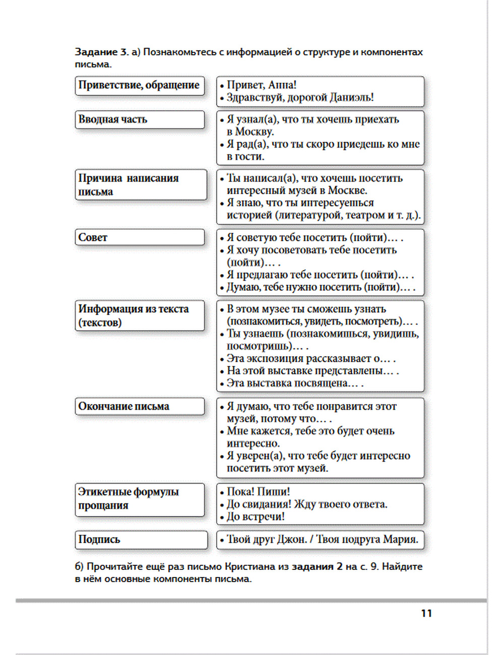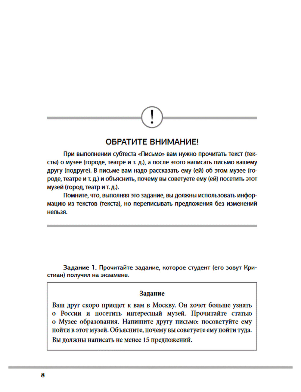 Пособие состоит из трёх частей. Первая часть знакомит учащихся с требованиями и содержанием первого задания субтеста «Письмо». Здесь представлены методические рекомендации и тренировочные материалы по созданию собственного монологического высказывания на основе прочитанных текстов в форме письма. Вторая часть пособия включает в себя 6 тренировочных вариантов данного субтеста. Третья часть содержит 6 вариантов второго тестового задания, которое заключается в создании учащимися своего собственного текста в форме письма на предложенную тему с опорой на вербальное описание ситуации.