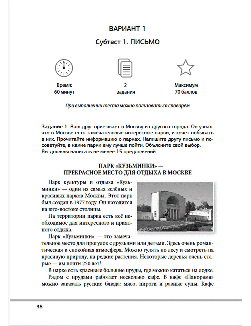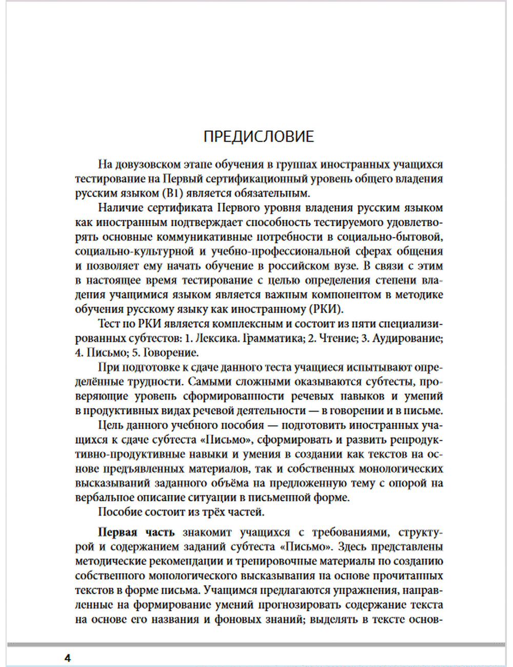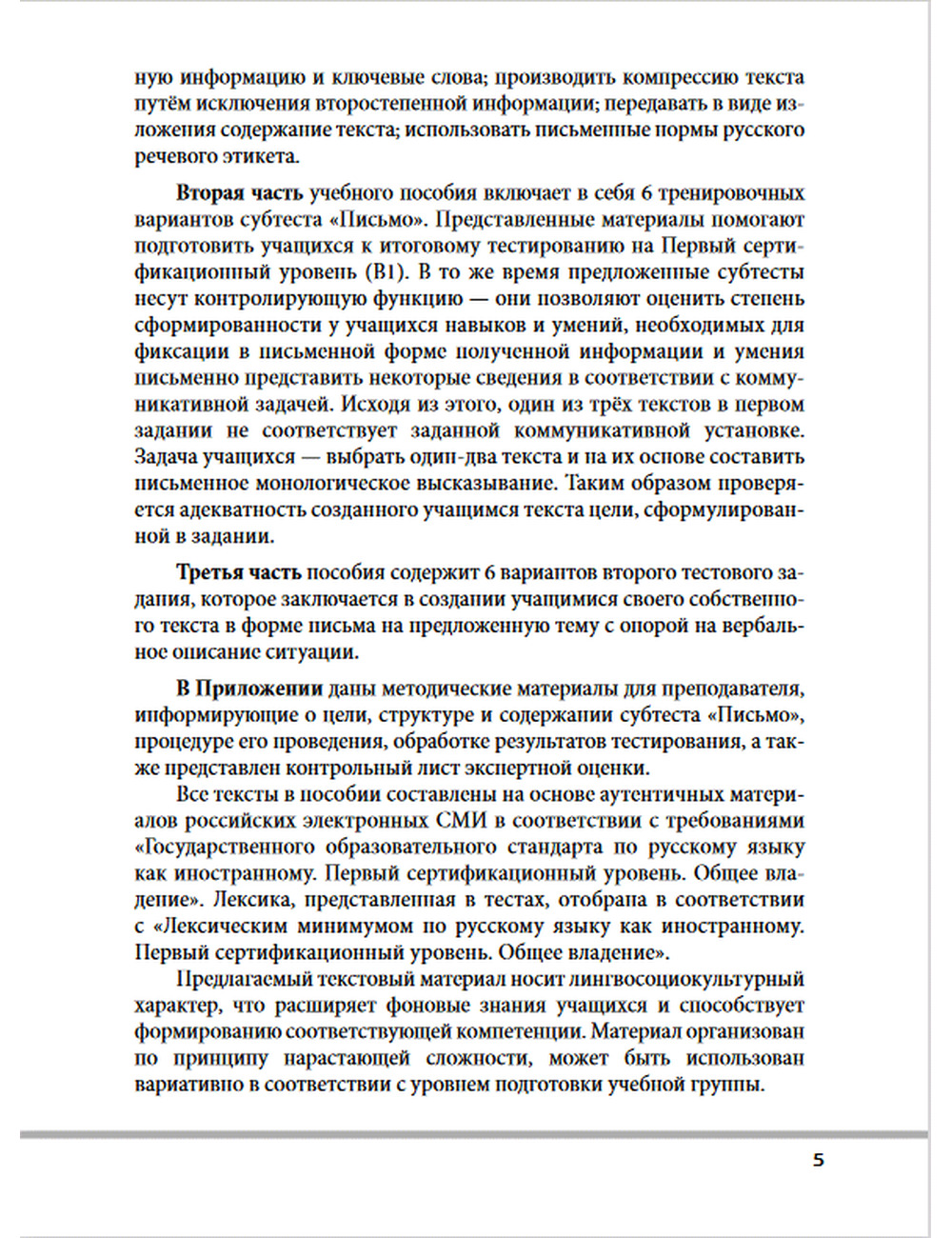 Цель пособия — подготовить иностранных учащихся к сдаче субтеста «Письмо» итогового тестирования на Первый сертификационный уровень (B1).