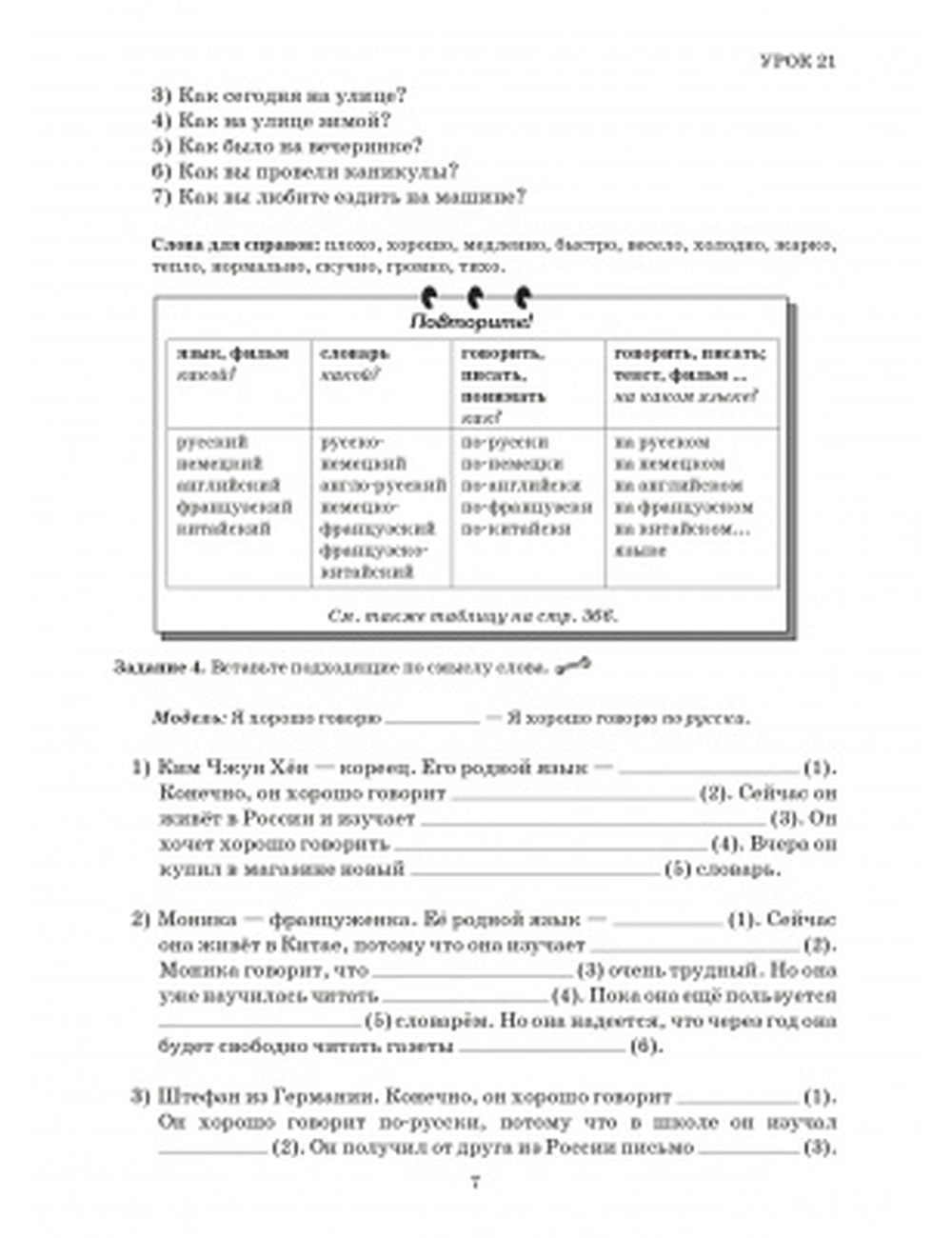 Пособие является завершающей частью учебного комплекса. Третья часть содержит 10 уроков (21-30, последний-повторительный). Усвоение лексико-грамматического материала рассчитано примерно на 200-240 часов аудиторных занятий. Пособие содержит сведения о системе склонения существительных, прилагательных, местоимений, порядковых числительных множественного числа; о правилах употребления деепричастий и причастий, глаголов движения; о способах выражения пространственных, временных, причинно-следственных, условных, целевых, уступительных отношений. В конце представлены проверочные работы к каждому уроку и таблицы, которые помогут учащимся упорядочить знания по грамматике русского языка на данном этапе. Имеется аудиоприложение. Ключи к заданиям размещены на сайте издательства.