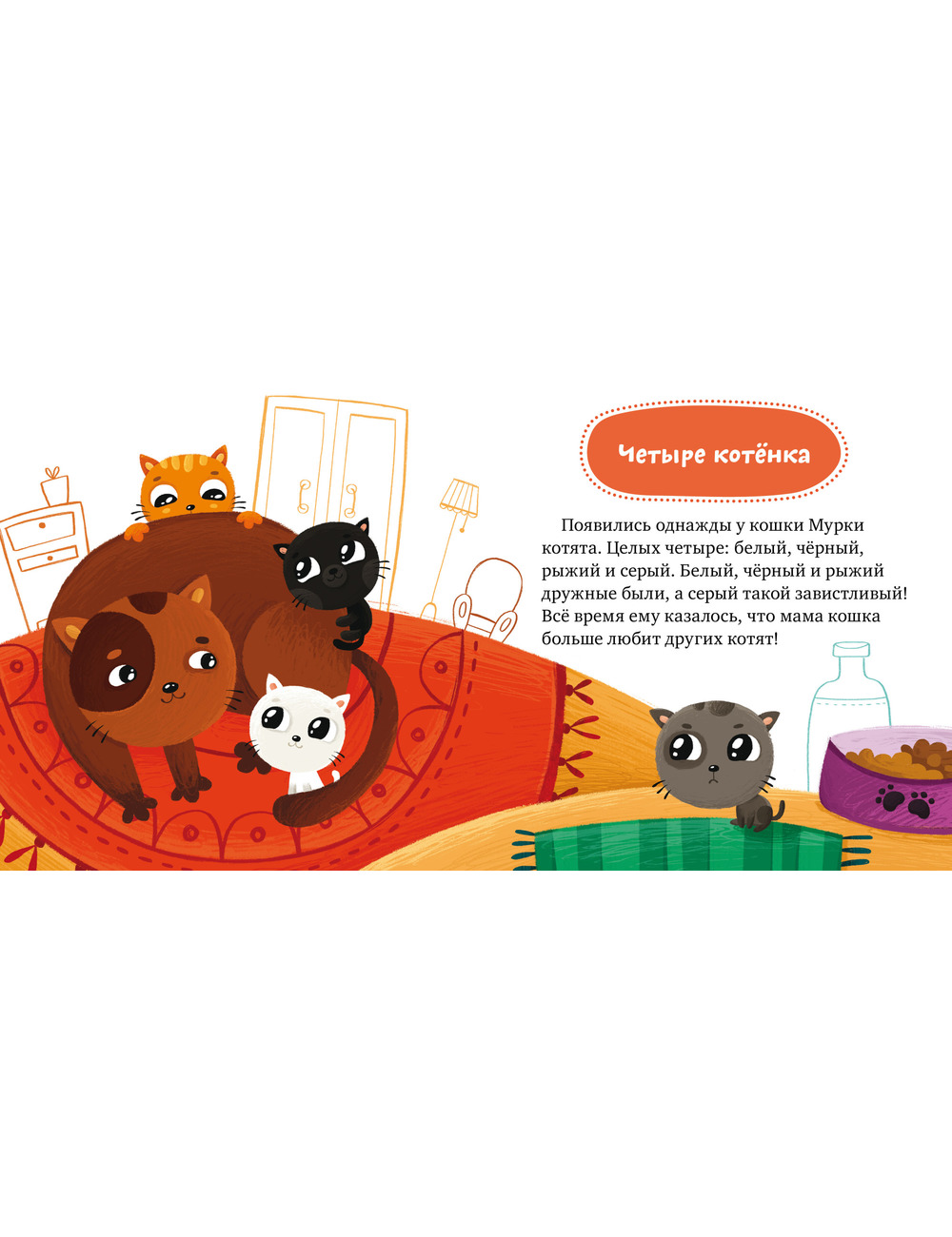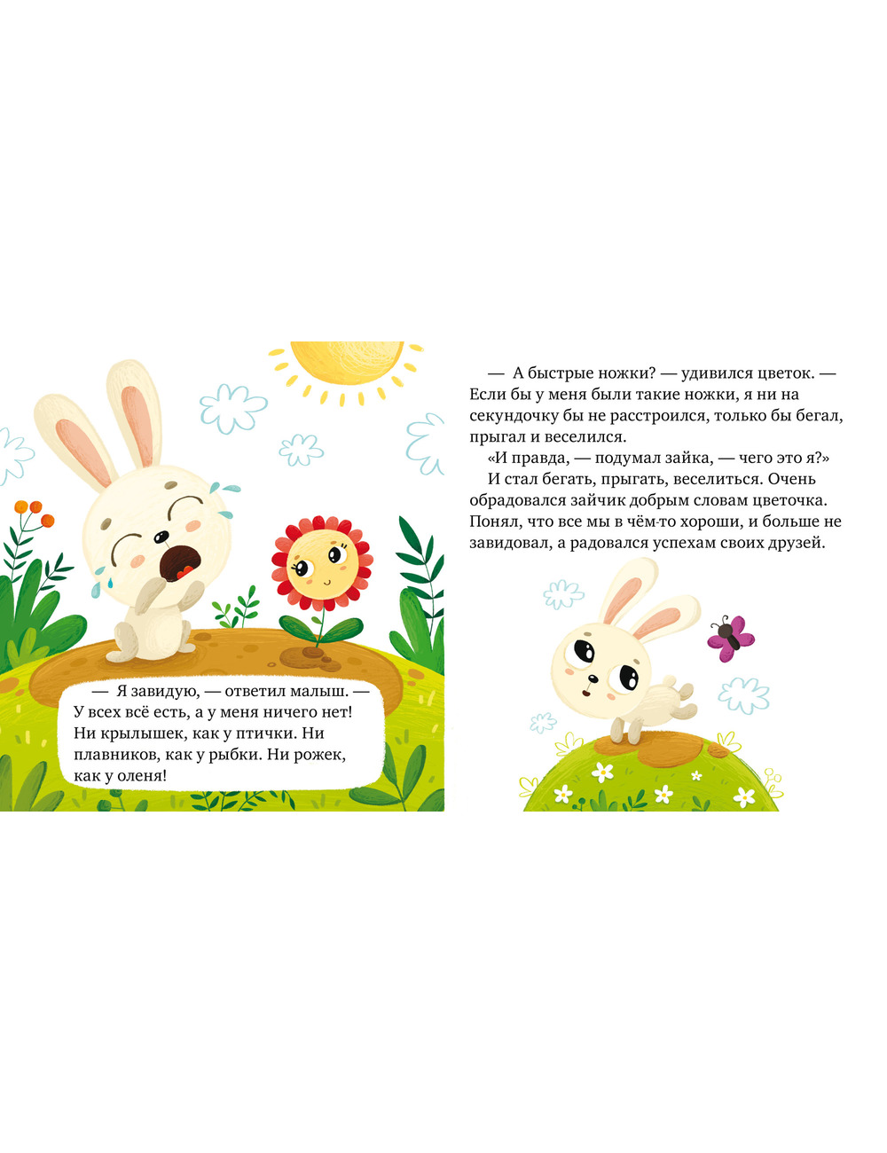 Маленький зайчик переживает: у птицы есть крылышки, у рыбки — плавники, а у оленя — рожки. Но, постойте, зайчику тоже кое-что досталось! Как только он это понимает, зависть исчезает бесследно. Вторая сказка — про братьев и сестричек. У кошки Мурки четыре котенка — белый, черный, серый и рыжий. Все живут дружно, и только серому котенку все время кажется, что его любят меньше всех. Но так ли это? Конечно же, мама кошка любит всех котят одинаково!