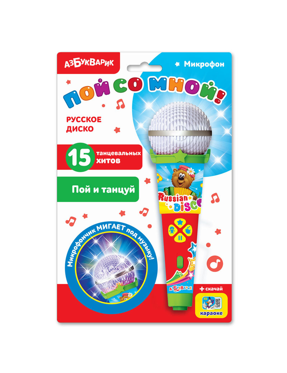 Этот микрофончик светится под музыку, а на каждой его кнопочке записано 5 танцевальных хитов, включая «Расскажи, Снегурочка», «Звёзды континентов», «Колыбельная медведицы», «Валенки», «Калинка», «Облака» и другие! + Бонус: возможность скачать музыкальную книгу «Караоке» для мобильного или планшета по QR-коду на упаковке.