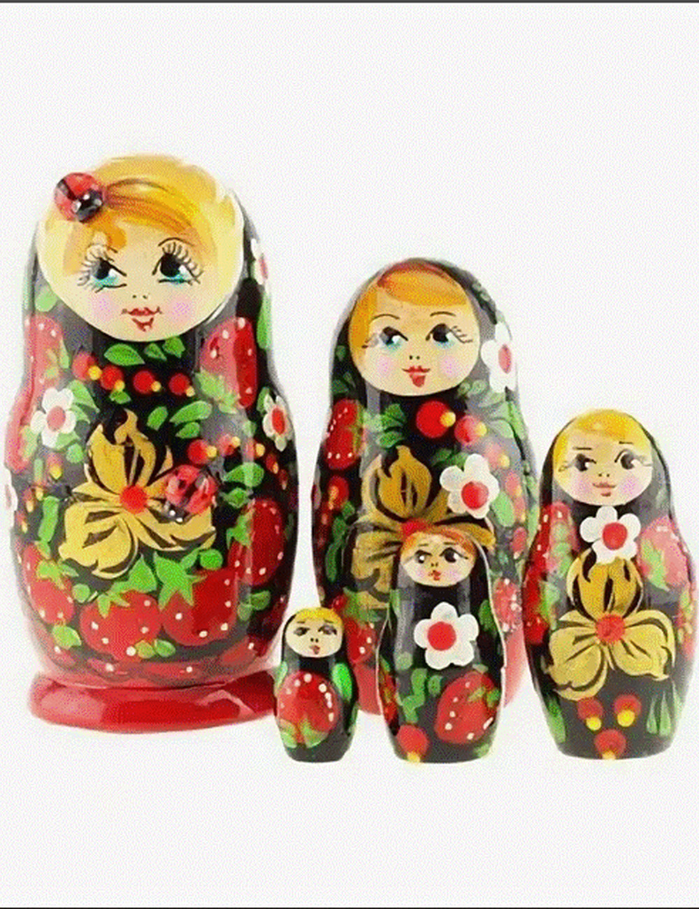Матрешка с нетрадиционной оригинальной росписью состоящая из 5 кукол "Хохлома-клубничка". Матрешка с хохломской росписью - оригинальное изделие, сочетающее сразу два вида русского народного искусства. Яркая цветовая гамма и изящный узор на платке прекрасно сочетается с хохломской росписью на платье.