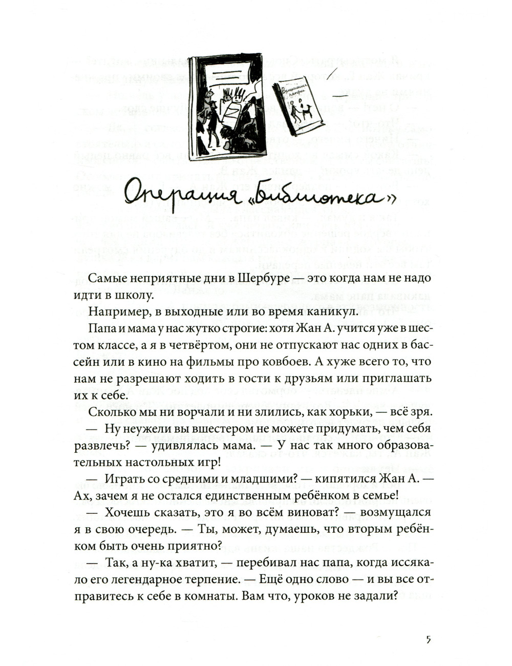 Приключения в большой шербурской семейке возникают как-то сами собой, в ничего не предвещающих на первый взгляд обстоятельствах. Поход в библиотеку - чем не повод для детективного сюжета с элементами заговора? Тайная рукопись Жана Б. на раз-два провоцирует такую битву подушками и такое метание носков, каких даже эта детская комната прежде не видывала. Долгие зимние вечера - и те полны событий, открытий, вдохновляющих и счастливых моментов. Иначе и не может быть в семействе, где шестеро сыновей, каждого из шестерых мальчишек зовут Жаном, а папа - словно седьмой Жан-сорванец, пусть и чуть-чуть взрослее.
