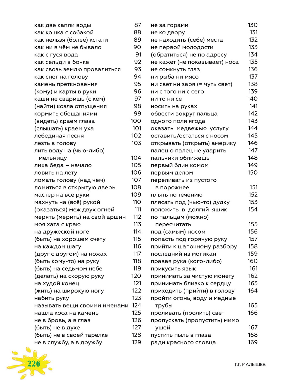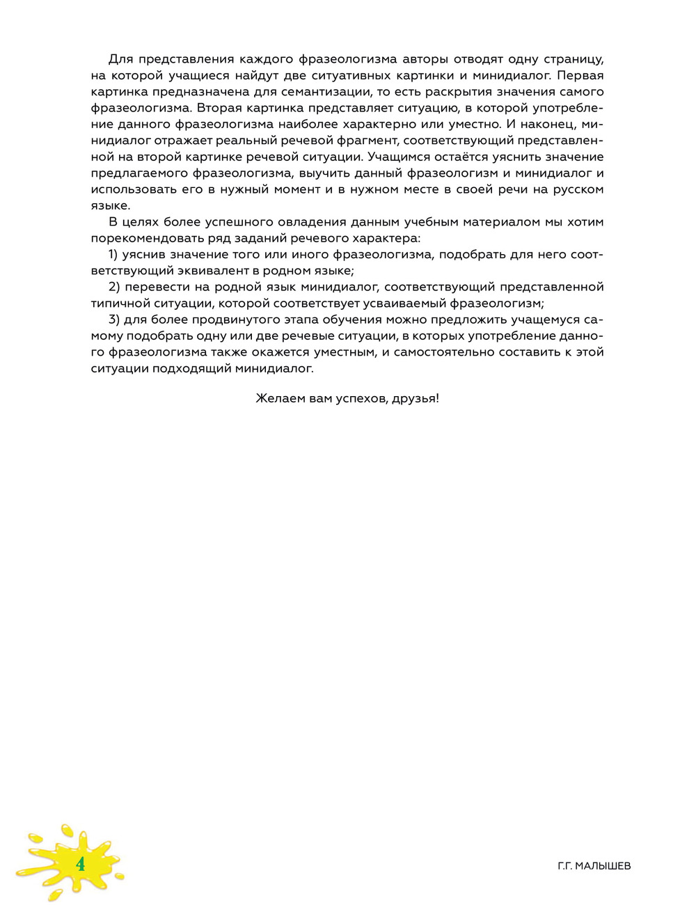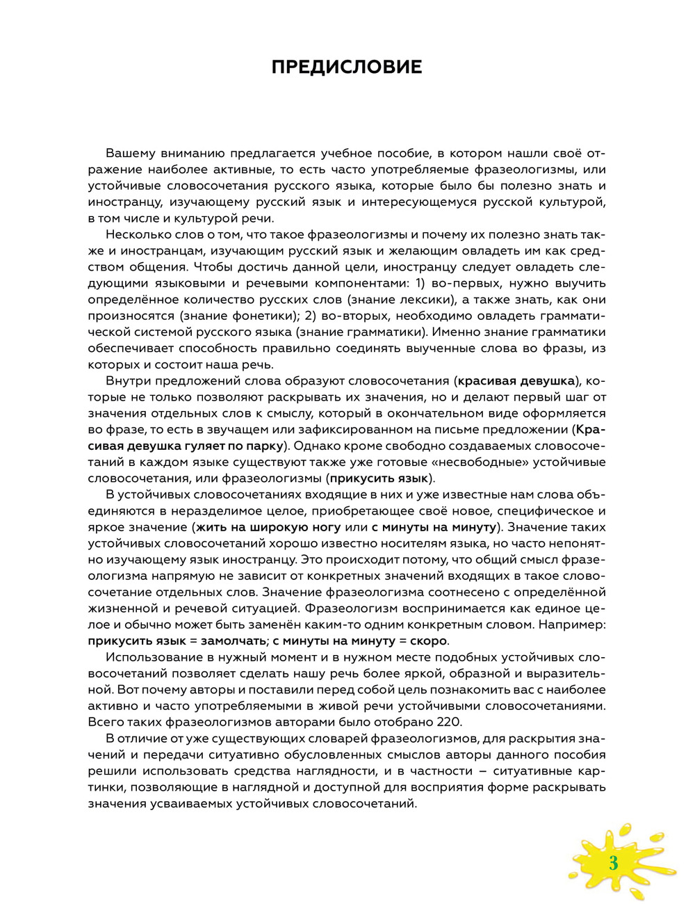 Данное пособие по русскому языку как иностранному представляет собой компактный словарь русских устойчивых словосочетаний в картинках. Автор текста и иллюстраций — Г. Г. Малышев, большой специалист в использовании иллюстрированного материала в преподавании РКИ. Словарь включает 220 устойчивых словосочетаний русского языка (и это необязательно пословицы и поговорки). Каждое из словосочетаний иллюстрируют две картинки: первая семантизирует словосочетание, а вторая показывает одну из возможных речевых ситуаций, в которых оно используется. Между двумя этими визуальными образами мы видим микродиалоги, показывающие примеры употребления в речи.