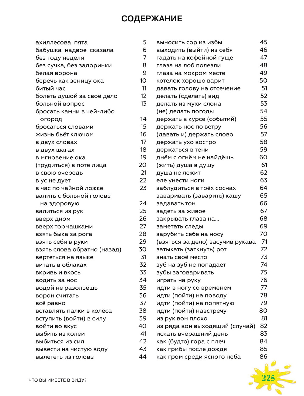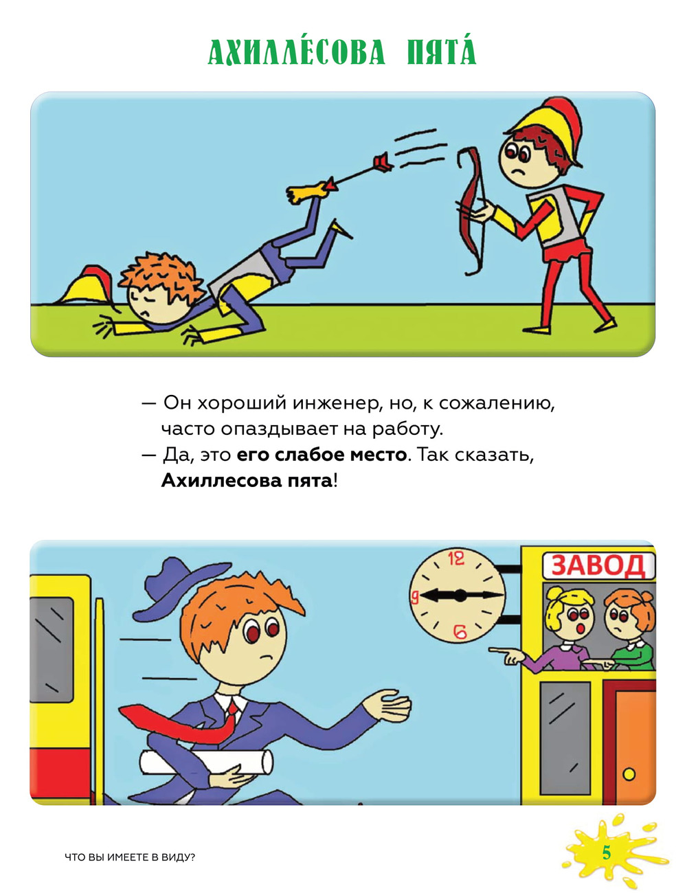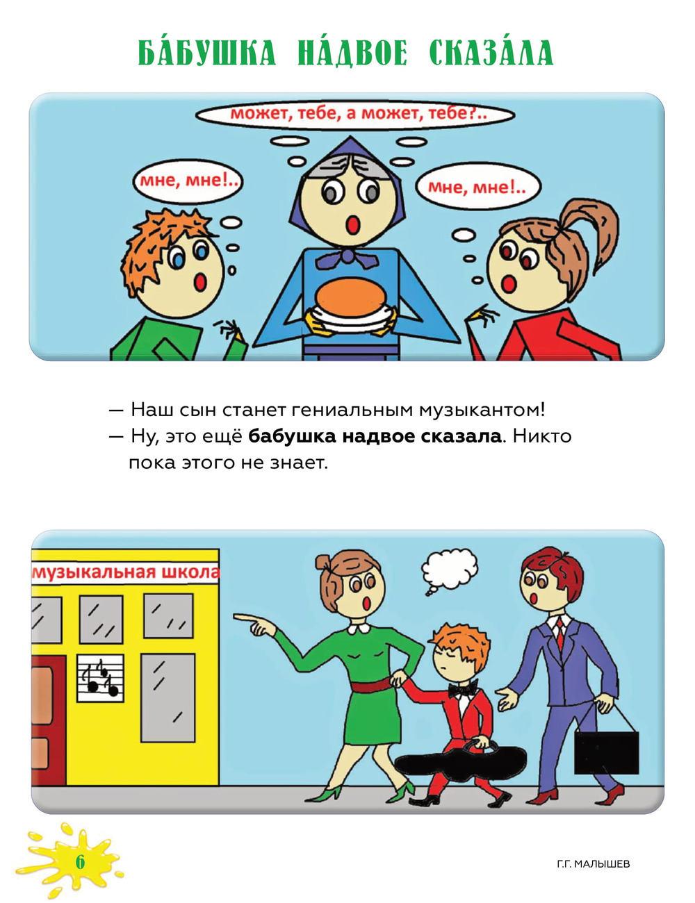 Данное пособие по русскому языку как иностранному представляет собой компактный словарь русских устойчивых словосочетаний в картинках. Автор текста и иллюстраций — Г. Г. Малышев, большой специалист в использовании иллюстрированного материала в преподавании РКИ. Словарь включает 220 устойчивых словосочетаний русского языка (и это необязательно пословицы и поговорки). Каждое из словосочетаний иллюстрируют две картинки: первая семантизирует словосочетание, а вторая показывает одну из возможных речевых ситуаций, в которых оно используется. Между двумя этими визуальными образами мы видим микродиалоги, показывающие примеры употребления в речи.