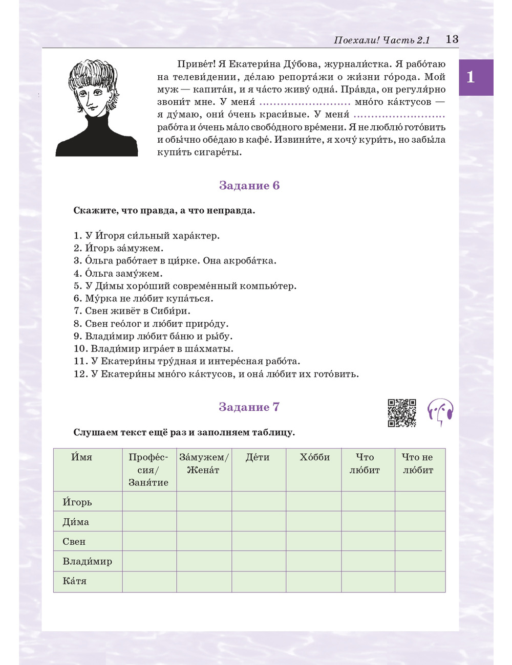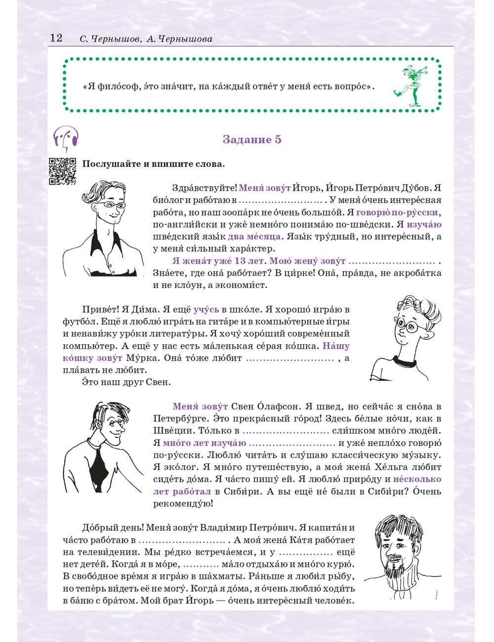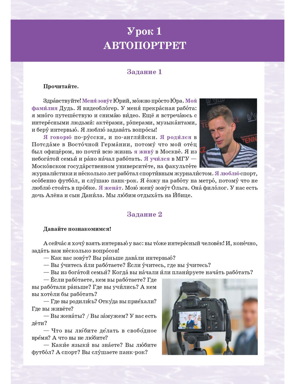 Вторая часть популярного курса русского языка для взрослых предназначена для продолжающих изучать русский язык на базовом — первом уровнях (А2–В1). Курс рассчитан в среднем на 80–120 часов. Его задача — обеспечение быстрого освоения разных аспектов языка и видов речевой деятельности. В учебнике совмещены грамматический и разговорный курсы. Имеются игровые задания, аудиоприложение, ключи. Послушать или скачать аудиофайл к заданию можно по QR-коду рядом с заданием.