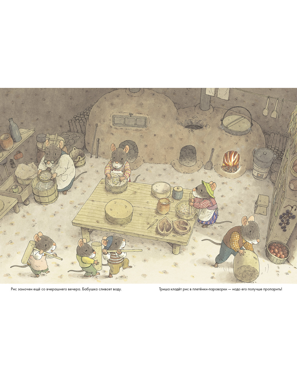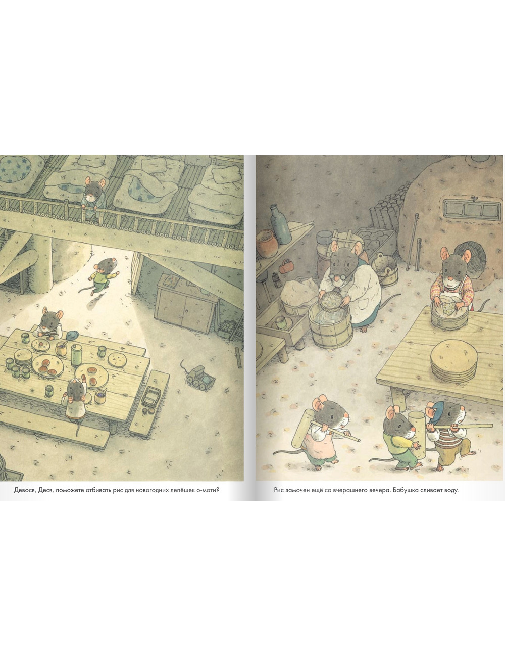 В каждой стране свои новогодние традиции! В книге «14 лесных мышей. Новый год» мышиное семейство готовит традиционное японское новогоднее блюдо — рисовые лепешки о-моти. Как любое праздничное блюдо, лепешки требуют усилий всех членов семьи — сделать тесто, развести огонь в специальных печурках, приготовить вкусные начинки! Чем больше постараться — тем вкуснее яства на новогоднем столе!