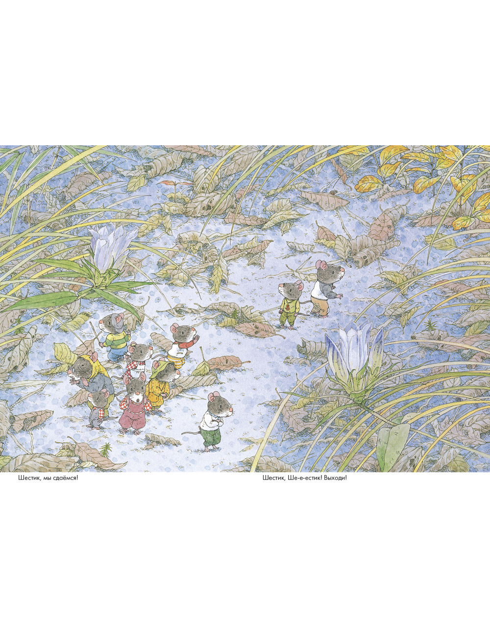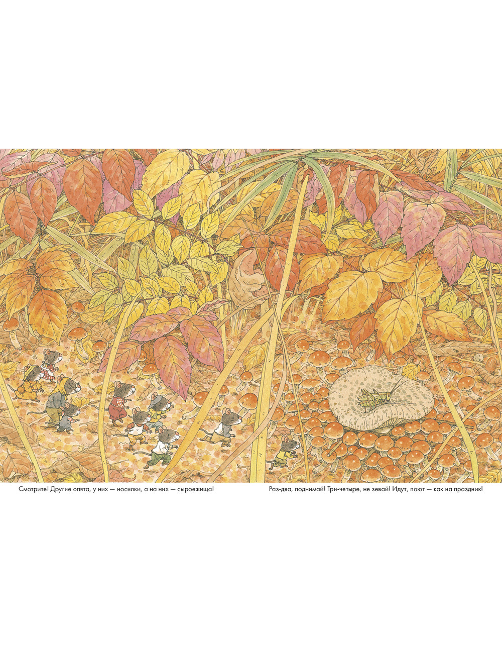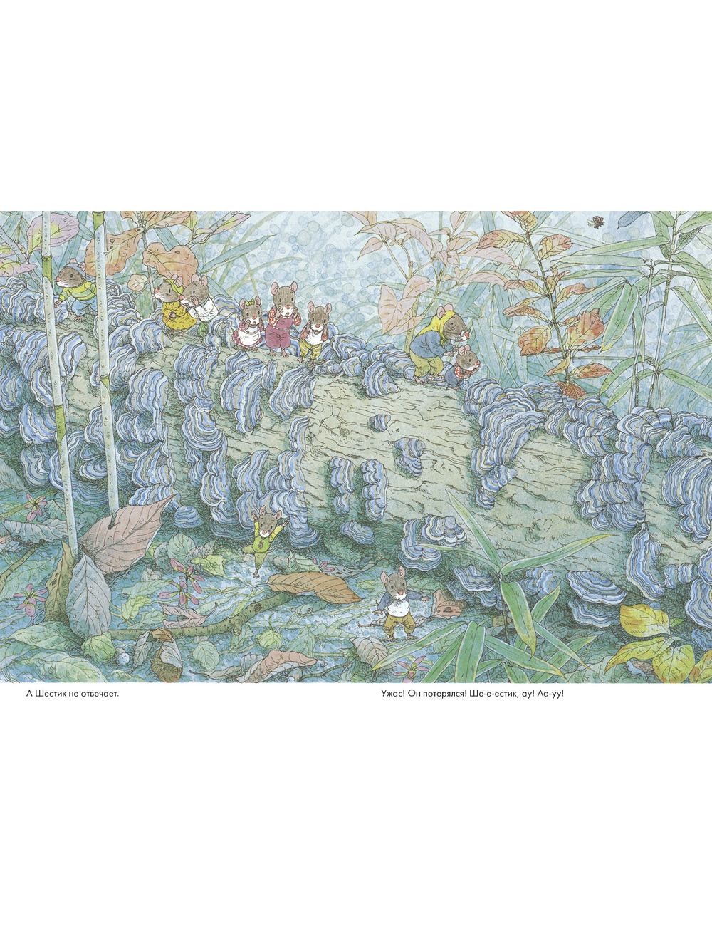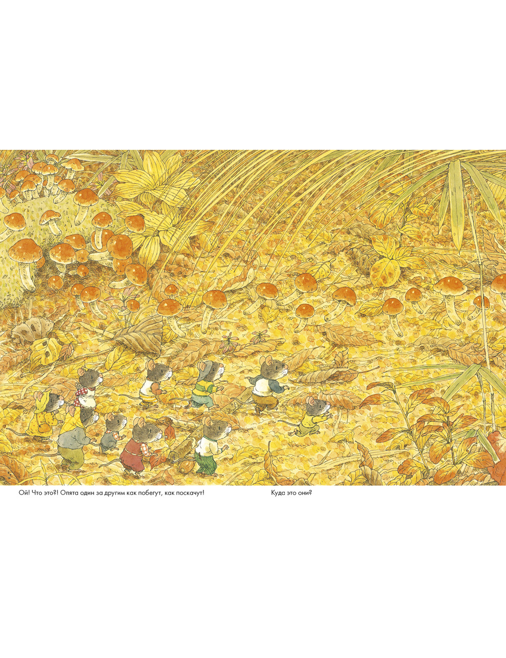 Семейство мышат играет в прятки в ярком осеннем лесу — легко спрятаться под листьями, за пеньками, между ветвей. Но вот все нашлись, а где же Шестик? В поисках малыша мышки заходят все глубже в лес и становятся свидетелями потрясающего зрелища — осеннего парада разноцветных грибов, плодов, ягод. Названия и зарисовки разных видов грибов можно найти на форзацах книги, и уже самим отправиться на поиски грибных сокровищ в лес!