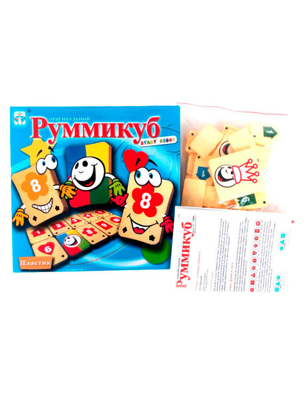Комплектация: игральные плитки - 40, плитки Покера - 2, плитки Руммикуб Король - 2, инструкция.