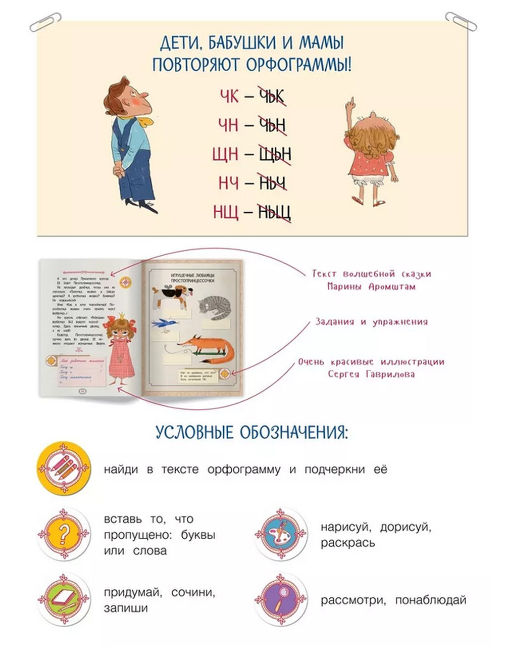 В каждой книге Марины Аромштам одна очень важная орфограмма, одна волшебная сказка (в ней орфограмма представлена так ярко, что не запомнить её невозможно!) и увлекательные задания, и упражнения. Дети читают смешные, волшебные истории, играя, выполняют упражнения — а правила усваиваются, грамотность растет, оценки улучшаются.