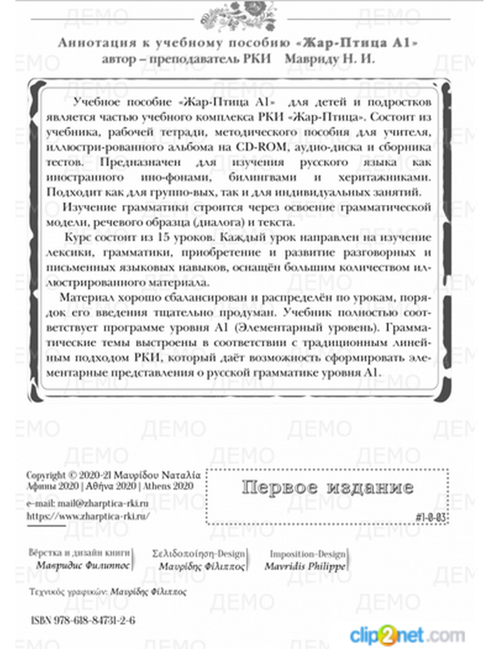 «Жар-Птица А1» для детей и подростков является частью учебного комплекса РКИ «Жар-Птица». Состоит из учебника, рабочей тетради, методического пособия для учителя, иллюстрированного альбома на CD-ROM, аудио-диска и сборника тестов. Предназначен для изучения русского языка как иностранного инофонами, билингвами и херитажниками. Подходит как для групповых, так и для индивидуальных занятий.