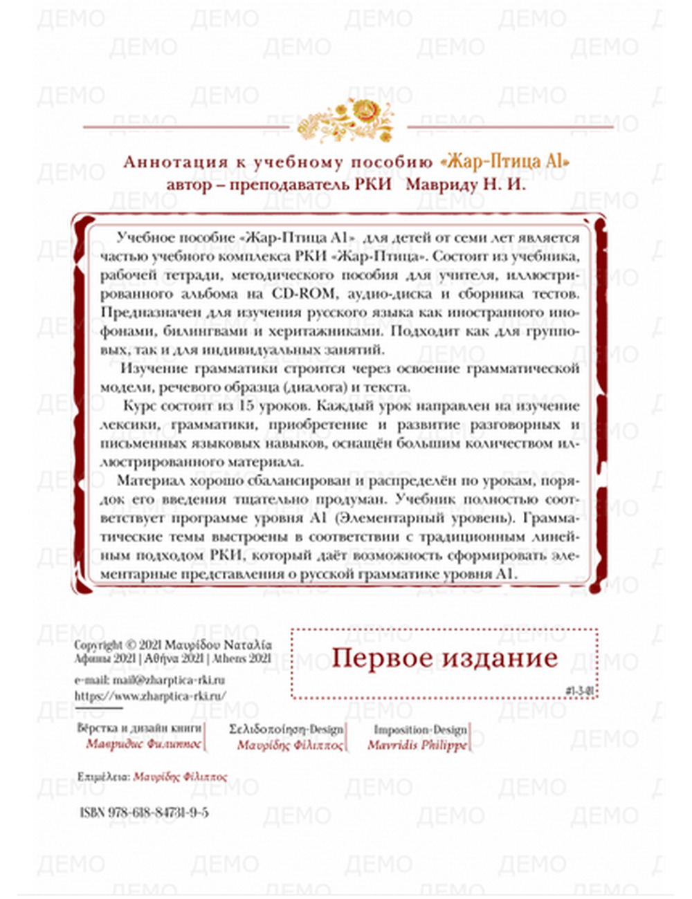 Учебное пособие «Жар-Птица А1» для детей и подростков является частью учебного комплекса РКИ «Жар-Птица». Состоит из учебника, рабочей тетради, методического пособия для учителя, иллюстрированного альбома на CD-ROM, аудио-диска и сборника тестов. Предназначен для изучения русского языка как иностранного инофонами, билингвами и херитажниками. Подходит как для групповых, так и для индивидуальных занятий.