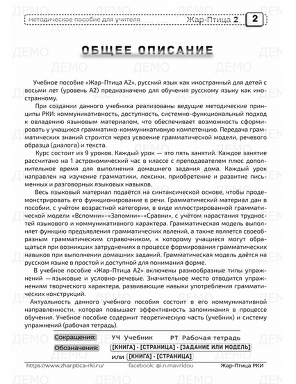 Учебное пособие «Жар-Птица А2» для детей и подростков является частью учебного комплекса РКИ «Жар-Птица». Состоит из учебника, рабочей тетради, методического пособия для учителя, иллюстрированного альбома на CD-ROM, аудио-диска и сборника тестов. Предназначен для изучения русского языка как иностранного и подходит как для групповых, так и для индивидуальных занятий.
