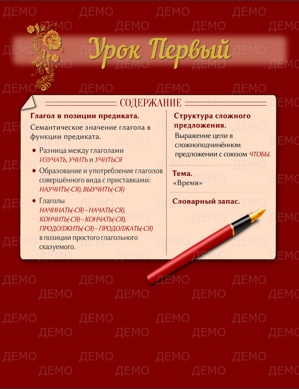 Состоит из учебника, рабочей тетради, методического пособия для учителя, иллюстрированного альбома на CD-ROM, аудио-диска и сборника тестов. Предназначен для изучения русского языка как иностранного и подходит как для групповых, так и для индивидуальных занятий.
