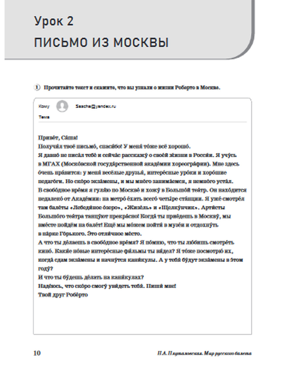 Работая в Московской государственной академии хореографии с подростками разных национальностей, автор видит, насколько лучше все учащиеся усваивают грамматику и лексику, когда последние даются в привязке к интересам и потребностям этой аудитории. Любая дискуссия в классе становится гораздо более оживлённой, если она идёт от частного, балетного, к общечеловеческому, а не наоборот. У взрослых студентов-балетоманов и тех, кто занимается танцами или гимнастикой для себя, тоже загораются глаза при виде имён своих кумиров и чтении малоизвестных театральных фактов. Но самое главное, что в этих случаях ни профессионалы, ни любители, ни дети, ни взрослые, увлекаясь процессом чтения и выполнения заданий, совершенно не замечают, как закрепляются языковые знания и оттачиваются умения, необходимые для реальной разговорной практики.