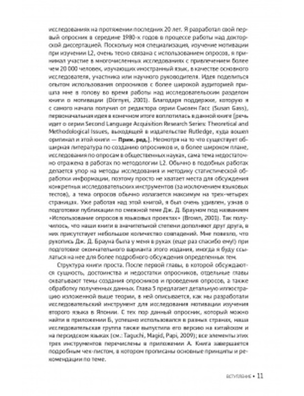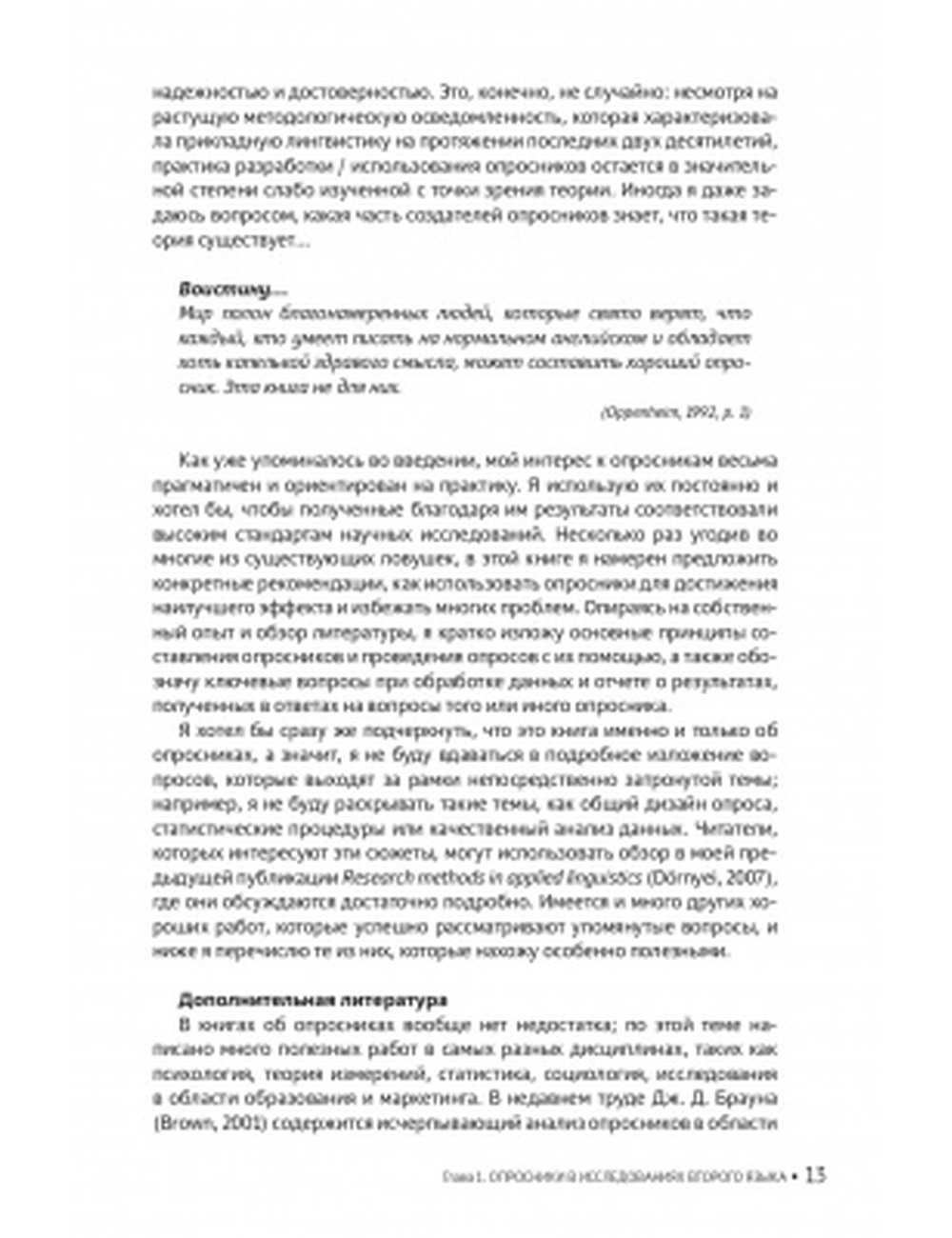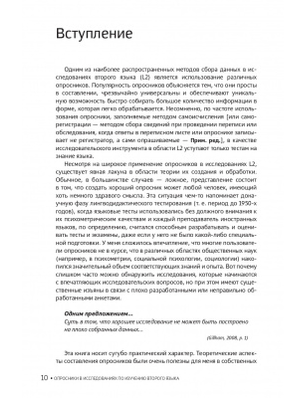 Первое руководство в области второго языка, посвященное вопросу о том, как создавать и использовать вопросники в качестве надежных и действенных исследовательских инструментов. Несмотря на то, что вопросники широко используются в исследовании иностранных языков, в области теории создания и обработки вопросников наблюдается недостаточная осведомленность. Слишком часто научные работы, в которых ставятся впечатляющие исследовательские вопросы, испорчены применением плохо разработанных вопросников или же ненадежными результатами из-за неправильной обработки данных.