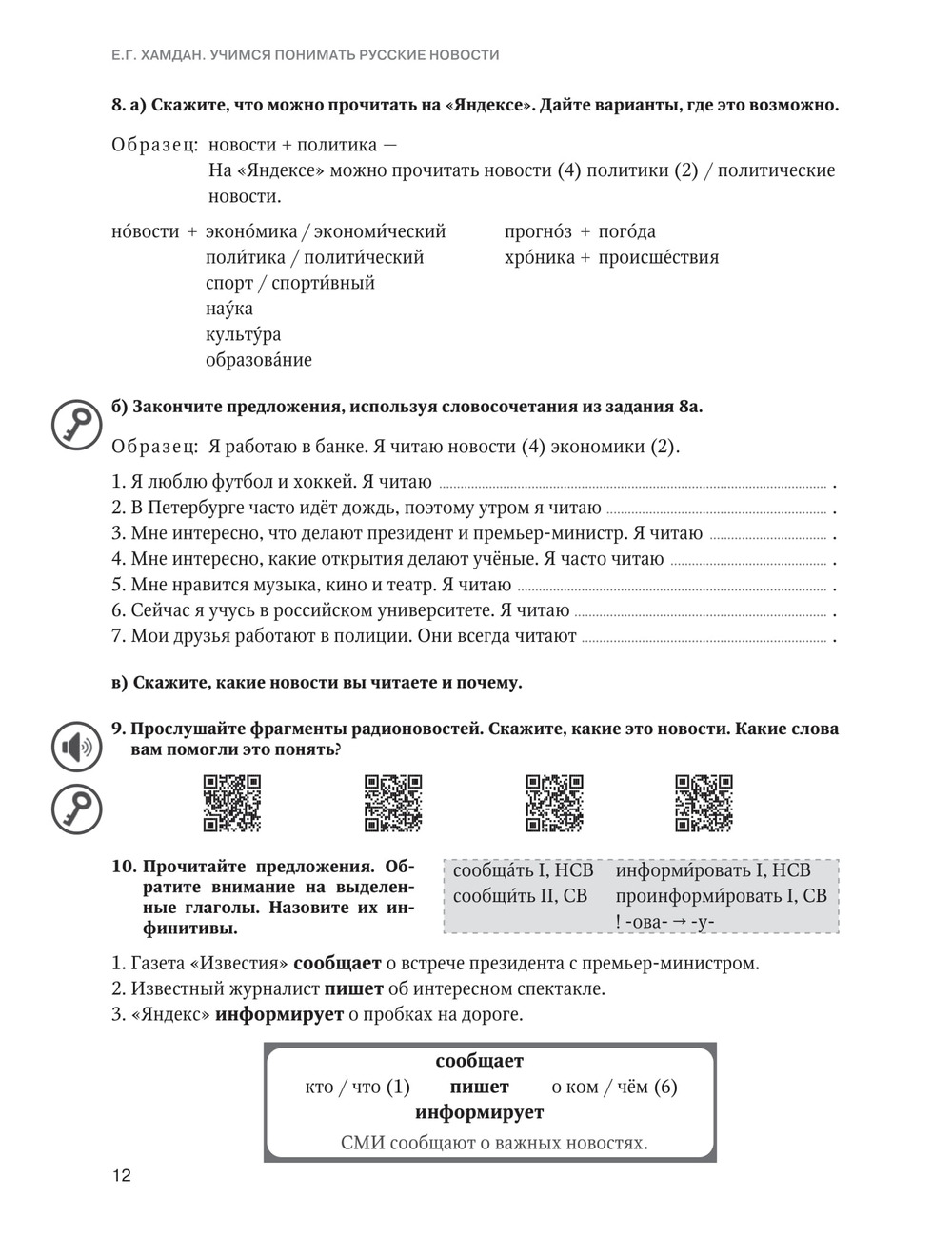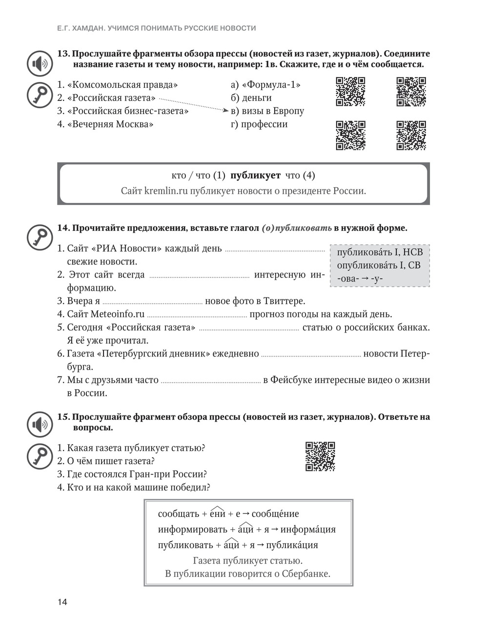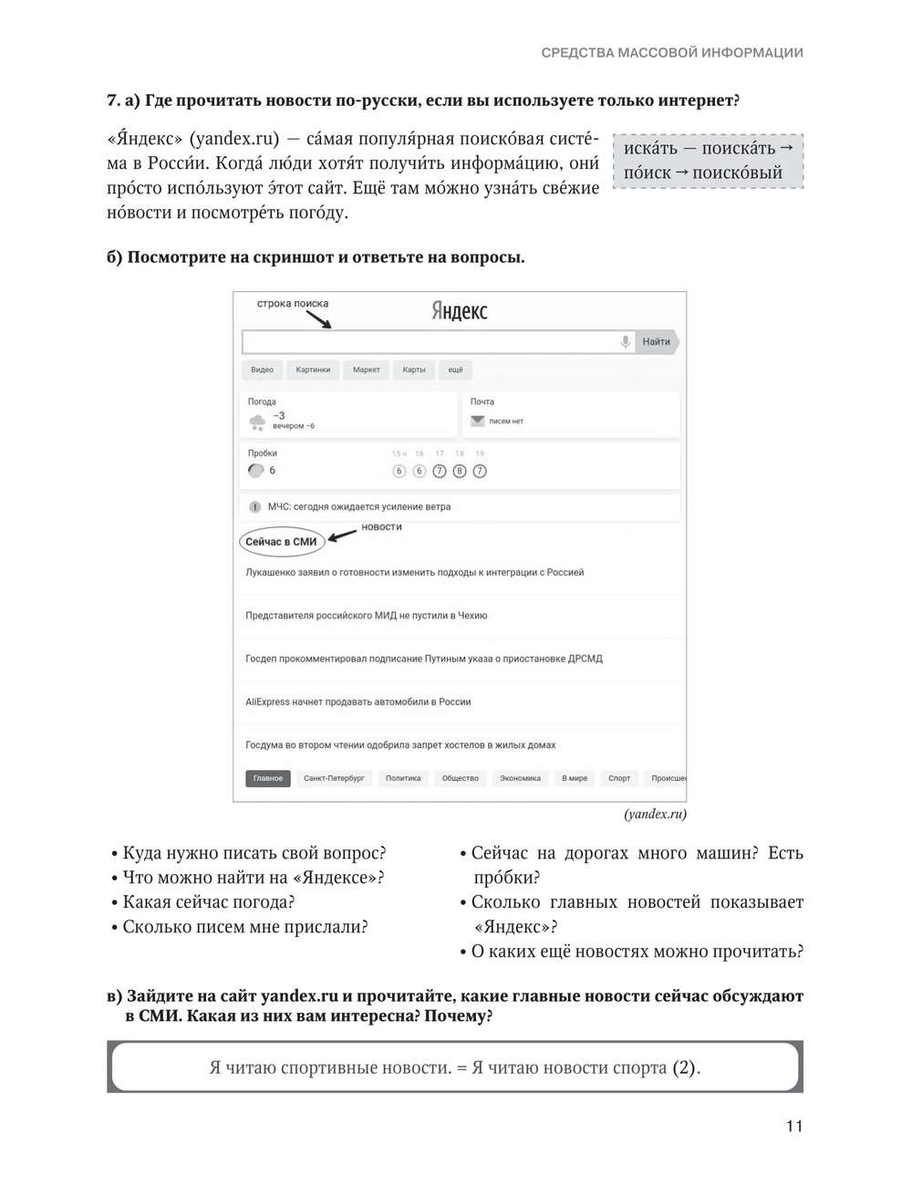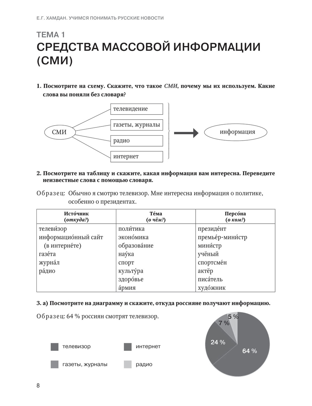 Учебное пособие предназначено для иностранцев, обучающихся на подготовительном факультете и владеющих русским языком на базовом уровне. Цель пособия — развитие навыков чтения, аудирования, говорения и письма на лексико-грамматическом материале публицистического стиля речи. Материал пособия основан на аутентичных печатных, аудио- и видеотекстах.