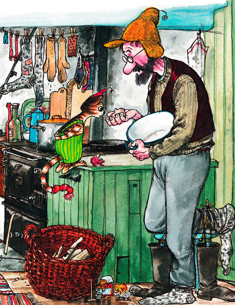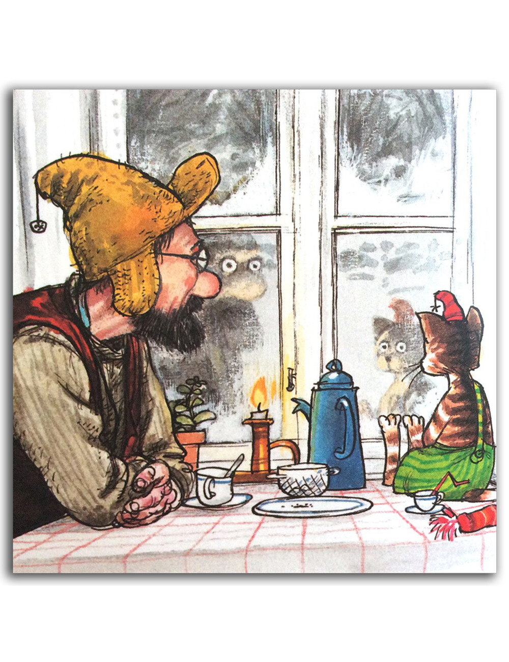 И вдруг случилась неприятность. Петсон поскользнулся и повредил ногу. Теперь он не сможет сходить в лес за елкой и в магазин, чтобы купить угощение.