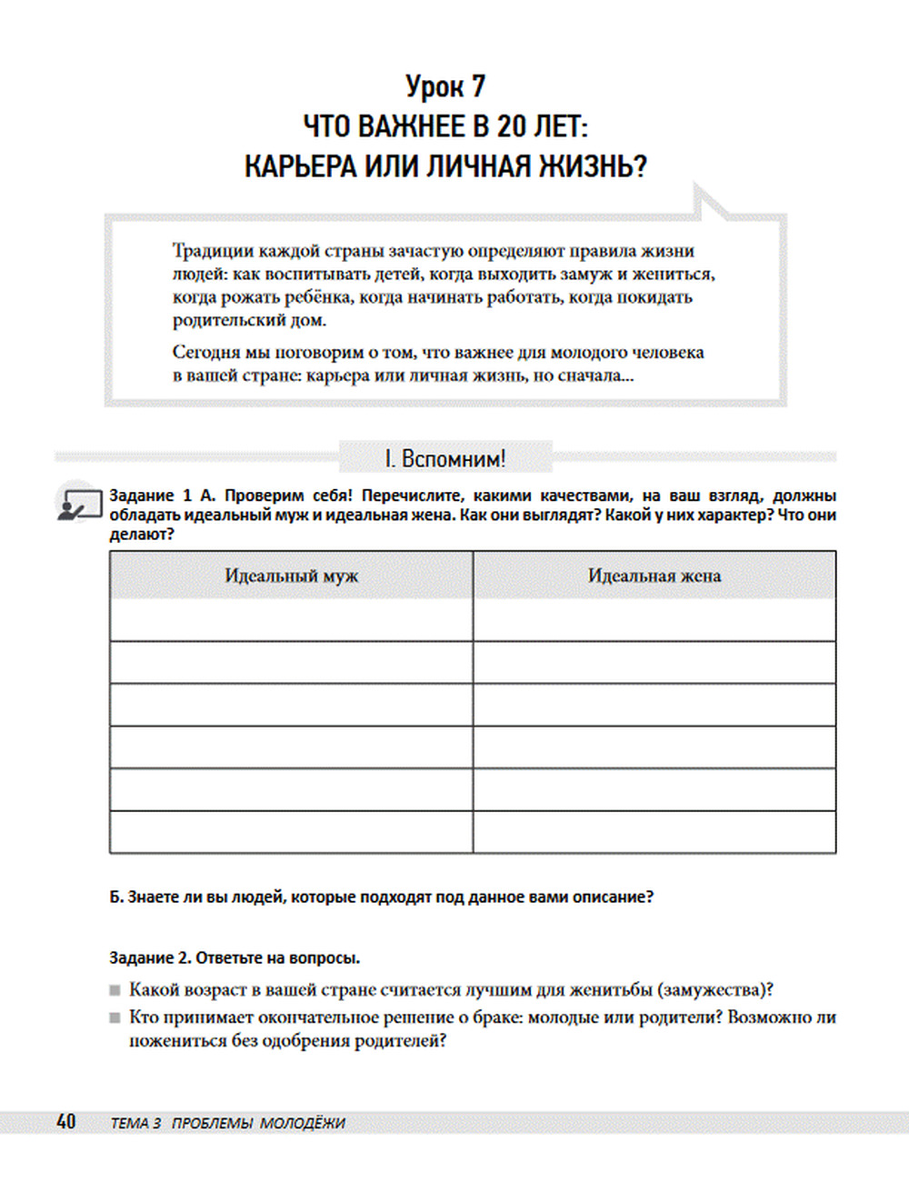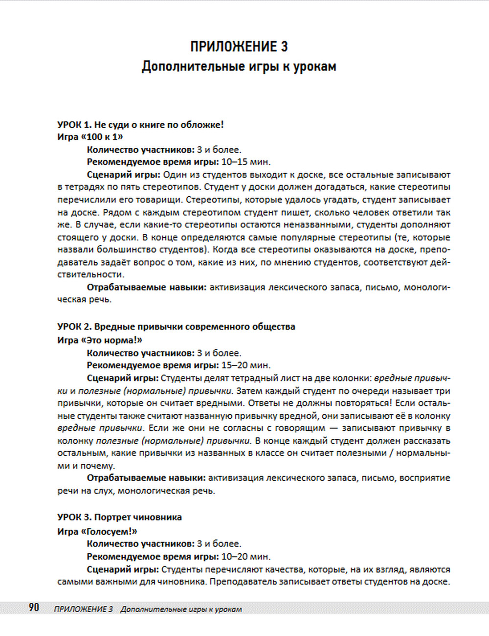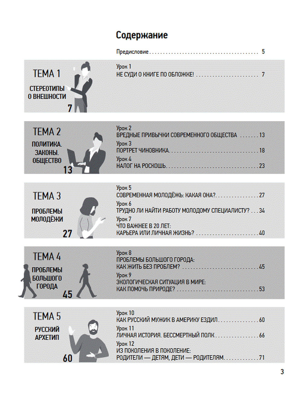 Пособие построено по тематическому принципу и состоит из 12 уроков, в каждый из которых включены задания на активизацию лексических, грамматических, речевых, аудиальных навыков на материале дискуссионно ориентированных аутентичных текстов. Многие условно-речевые и речевые задания уроков (дискуссии, проекты, презентации) направлены на работу в команде, что способствует более быстрому достижению коммуникативной компетенции уровня В2.3-В2.4.