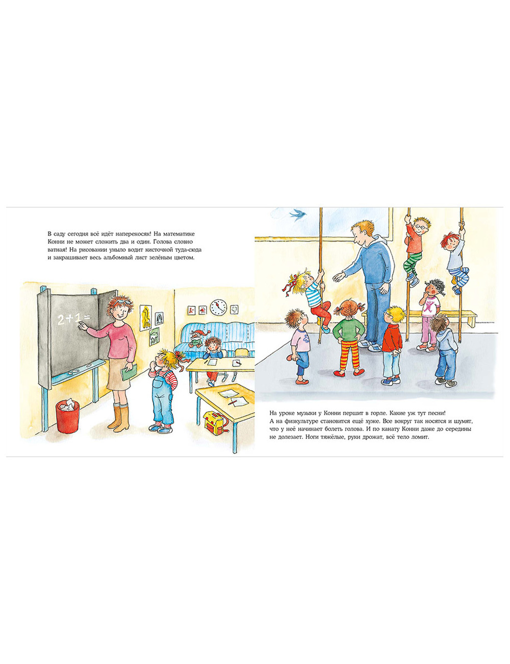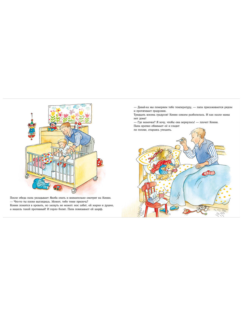 Даже самый крепкий и здоровый малыш время от времени болеет. Вот и у Конни мама уехала в командировку, дома с Конни и Якобом остался один папа, а Конни как назло разболелась. Горло саднит, нос заложен и даже поднялась температура. Справится ли папа без мамы? Конечно! Даже соблюдать постельный режим и пить все лекарства, которые выпишет доктор, с ним будет совсем не скучно. И к возвращению мамы у них все будет хорошо.