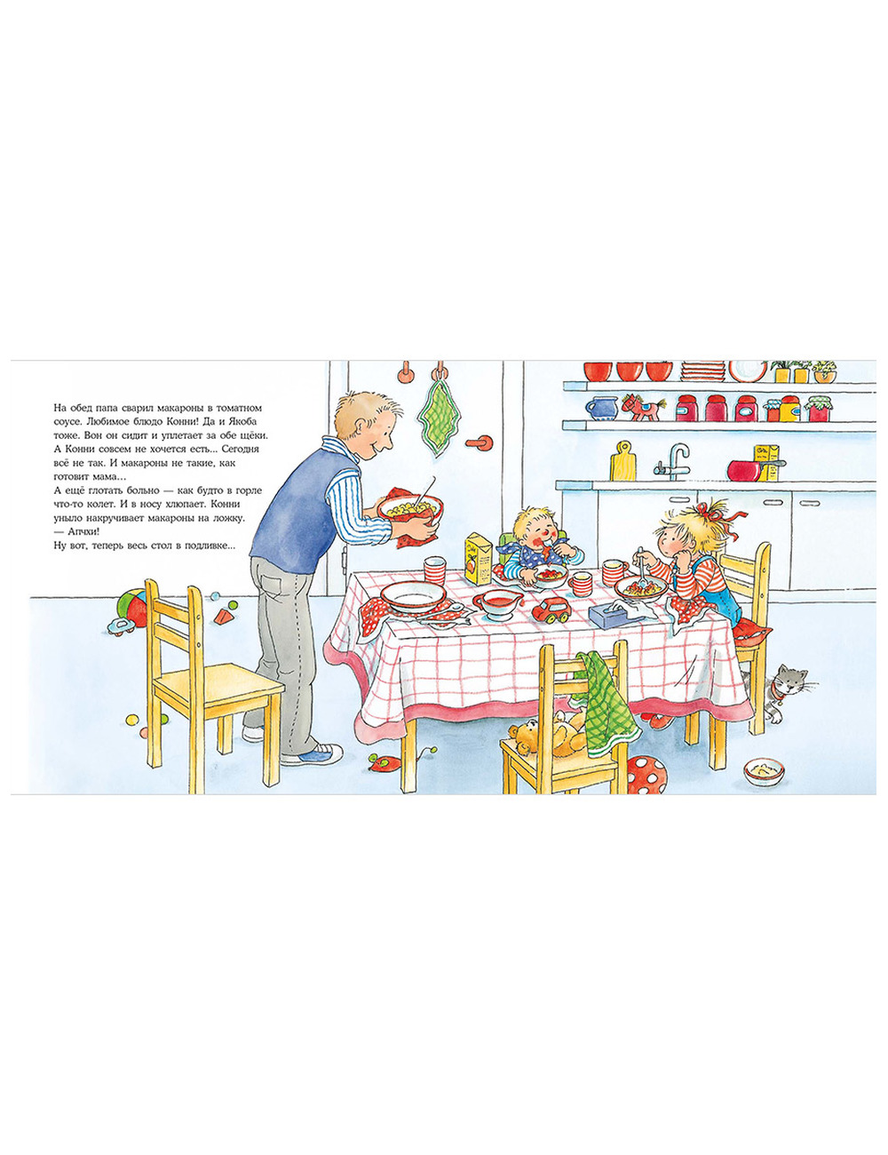 Изучили все иллюстрации? Предложите малышу рассказать, что происходит на картинках. Что папа приготовил для Конни и Якоба на обед? Во что Якоб играет в гостиной?
