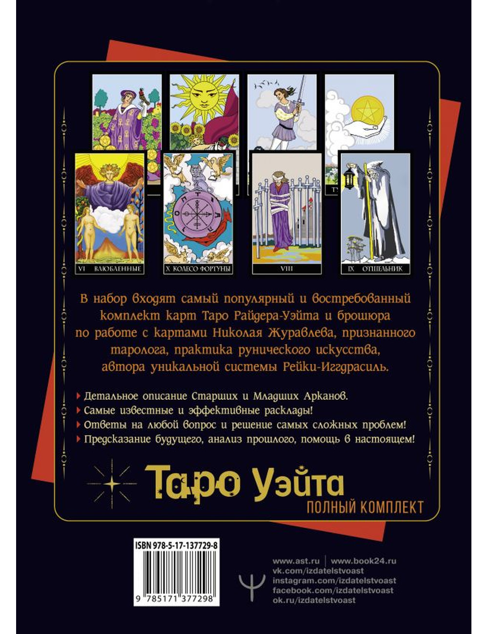 Набор состоит из колоды карт Таро Райдера Уэйта, самой известной, признанной всеми эзотериками и тарологами, и подробного руководства для гадания Николая Журавлева. Эффективные расклады и подробное описание Старших и Младших Арканов сделают работу с колодой комфортной как для начинающего таролога, так и для опытного эзотерика.
