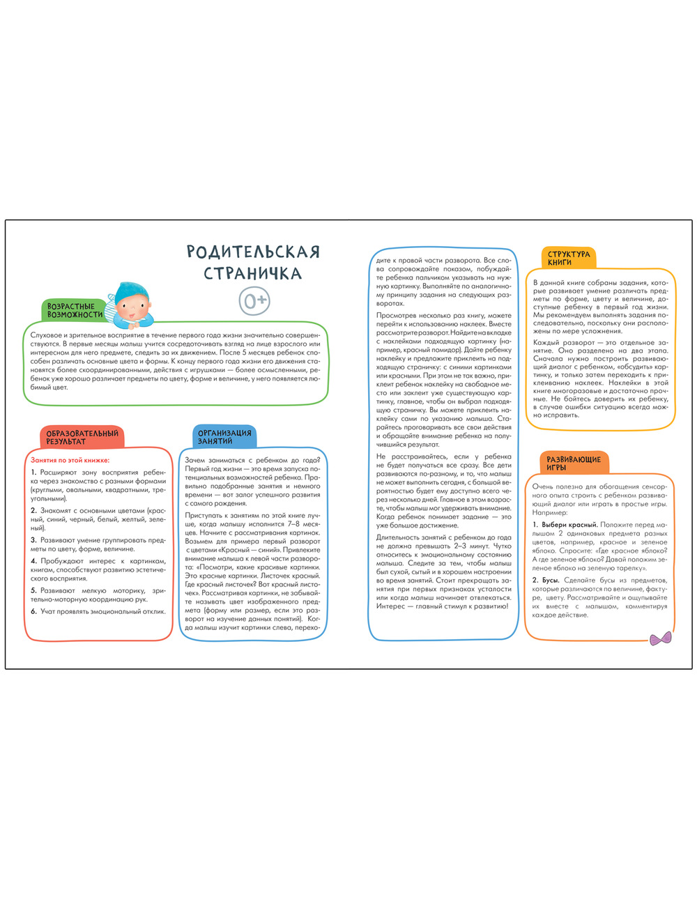 Книга «Цвет, форма, величина 0+» из серии «Школа Семи Гномов. Активити с наклейками» предназначена для обогащения сенсорного опыта у детей от рождения до года, способности сопоставлять величину предметов, определять их форму.