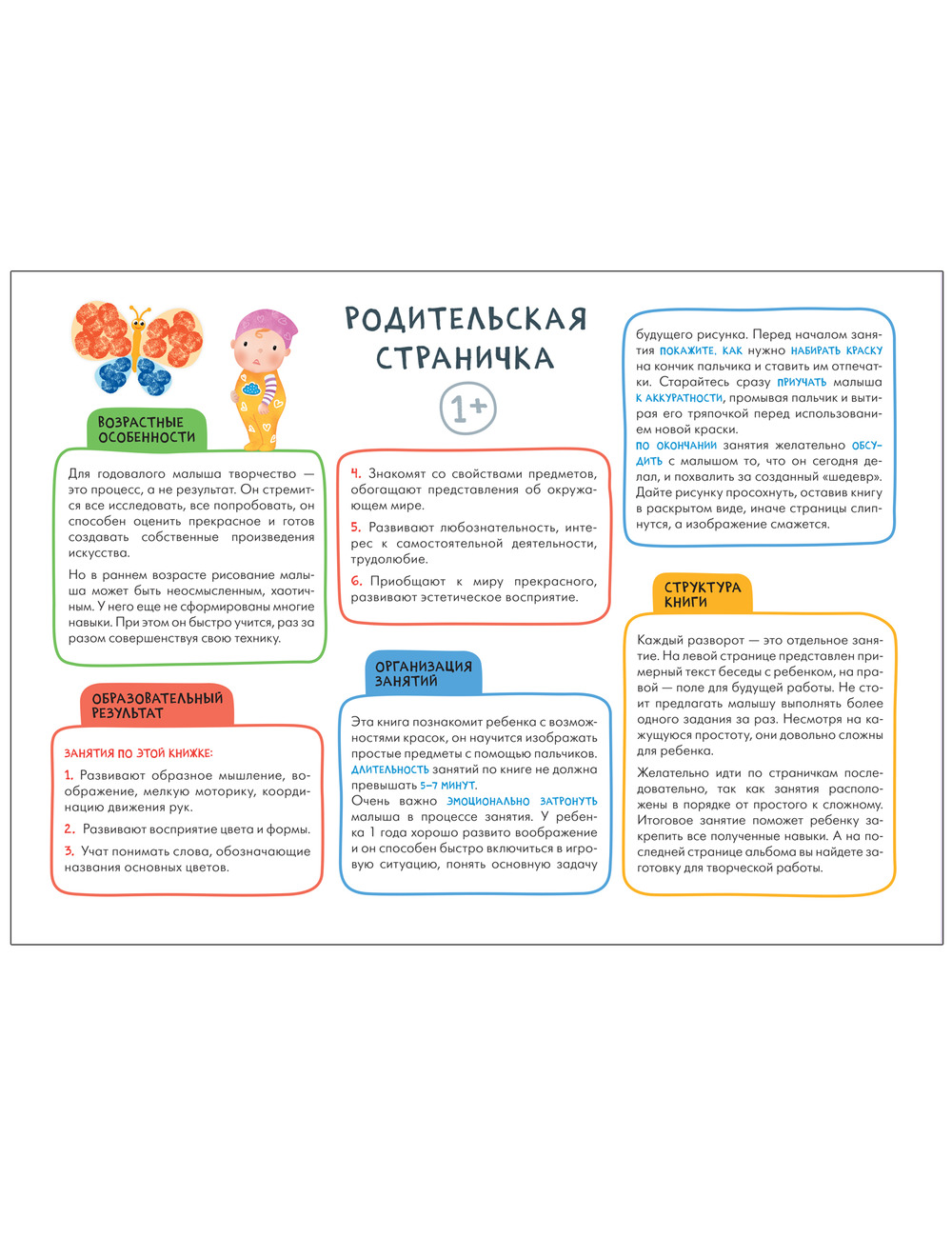 Книга «Рисуем красками 1+» из серии «Школа Семи Гномов. Мастерская» — это альбом для занятий рисованием с ребенком от 1 года до 2 лет. Занятия на близкие и понятные ребенку темы расположены по мере усложнения: поступательно переходя от освоения простых навыков к более сложным заданиям, ребенок научится рисовать с помощью пальчиков и создавать красочные рисунки.
