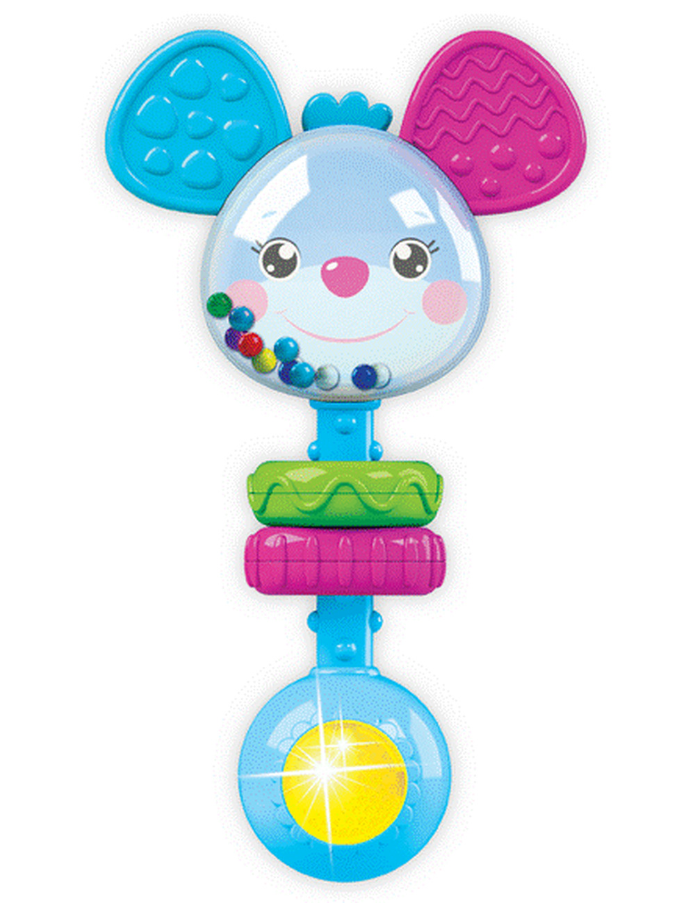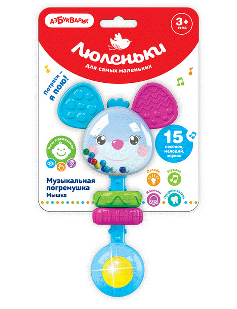 Музыкальная погремушка для малыша в виде забавной мышки с мягкими ушками! Ребенку нужно просто потрясти погремушку – и мышка споет песенку. Всего в игрушке 15 песенок, мелодий и звуков («Это кто у нас маленький такой?», «Как хорошо нам с мамочкой», «Чижик-пыжик», «Танец зверят» и др.), а также множество активных элементов. Яркий огонек привлекает внимание, цветные шарики весело звенят! А рельефные силиконовые ушки и пластмассовые колечки развивают тактильные ощущения – ребенку будет приятно потрогать их пальчиками.