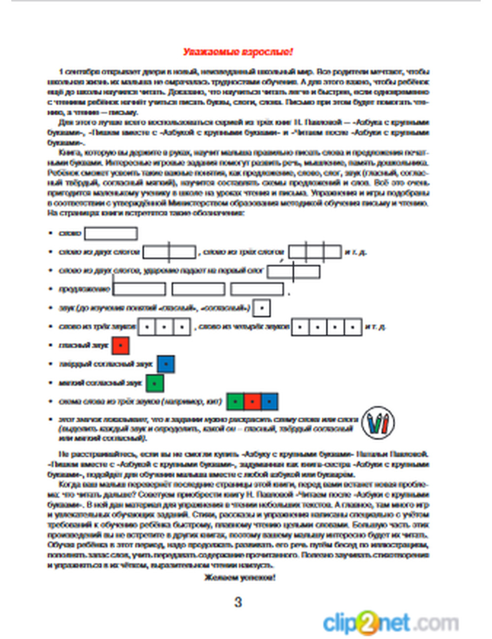 научить малыша читать легче, если одновременно с чтением он будет учиться и письму. В книге нет скучных заданий, и обучение будет походить скорее на занимательную игру. Не расстраивайтесь, если вы не смогли купить «Азбуку с крупными буквами» Натальи Павловой. Эта книга подойдет для обучения по любой азбуке или букварю и будет полезна как тем детям, которые только учатся читать, так и тем, кто недавно освоил этот навык. Начните заниматься сейчас, и обучение о школе покажется вашему малышу лёгким и интересным. Желаем успеха!