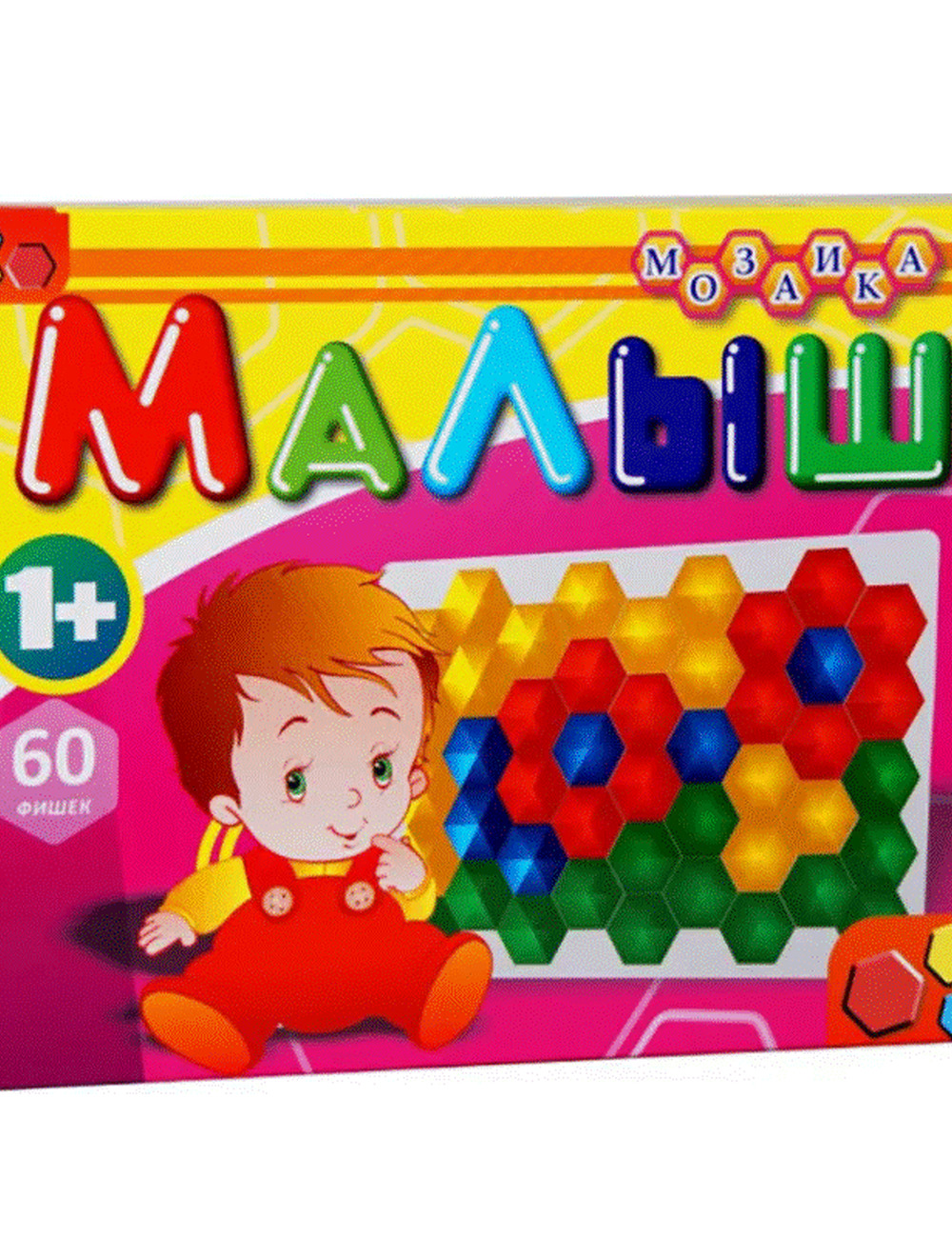 Мозаика для самых маленьких. Фишки очень крупные, диаметр 4,5 см. Фишки не на ножке, а одеваются на выпуклые соты поля.Примеры сборки приведены на коробке.Размер поля 27х37 см