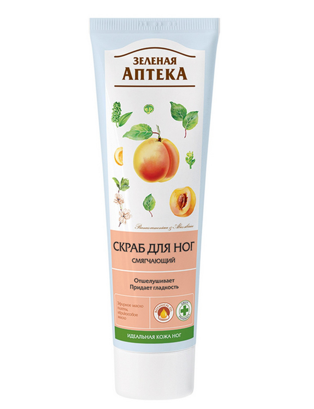 Бережно очищает кожу стоп, возвращает ей гладкость и мягкость. Пудра из абрикосовых косточек способствует удалению ороговевших клеток. Эфирное масло пихты и чайного дерева оказывают антисептическое действие, устранят неприятный запах. Абрикосовое масло питает и смягчает кожу.