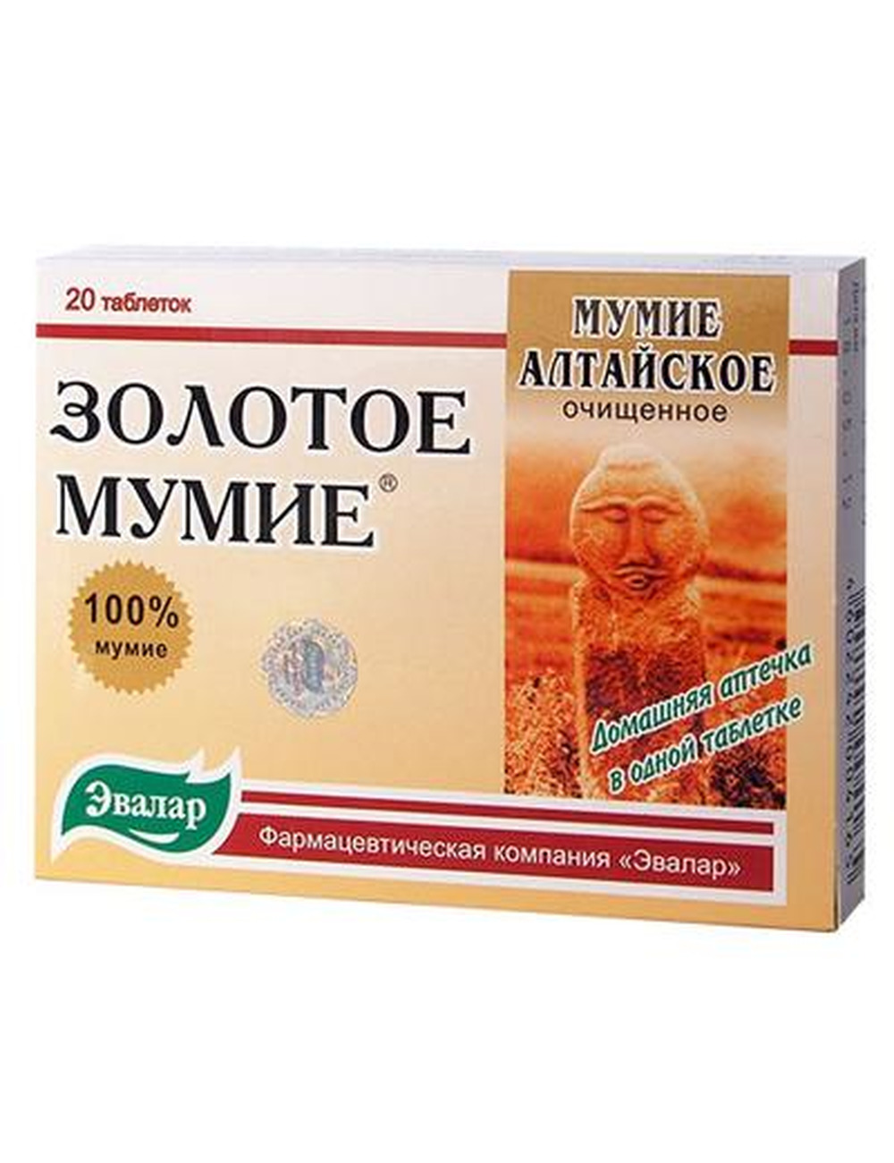 Золотое мумие алтайское очищенное для поддержания нормального состояния костной ткани способствует: более быстрому восстановлению костной ткани при травмах, усилению процессов регенерации (самовосстановления) тканей, повышению защитных сил организма. Именно Золотое мумие Эвалар стало самым продаваемым в России - марка №1 среди БАД с мумие. Гарантия качества: производится по международному стандарту качества GMP. Золотое мумие от компании Эвалар - это 100% очищенное алтайское мумие, изготовленное по оригинальной технологии, которая позволяет максимально сохранить активно действующие вещества: витамины, аминокислоты и более 30 микро- и макроэлементов с высокой биодоступностью. Настоящий золотой стандарт алтайского мумие! Всевозможные биологически активные добавки стремительно вошли в нашу жизнь и стали ее неотъемлемой частью. Компания -Эвалар- представляет вашему вниманию средство -Золотое мумие- алтайского происхождения, изготовленое с использованием уникальной технологии. Данное средство состоит из максимально сохраненных активно действующих веществ: аминокислот, витаминов, макро- и микроэлементов, имеющих высокую биодоступность. Таблетки -Золотое мумие- обладают общеукрепляющими и тонизирующими свойствами. Согласно инструкции по применению, золотое мумие способствует: развитию процессов метаболизма в мышечной и костной тканях при ушибах или травмах; протеканию регенерирующих процессов в тканях; повышению защитных свойств организма.