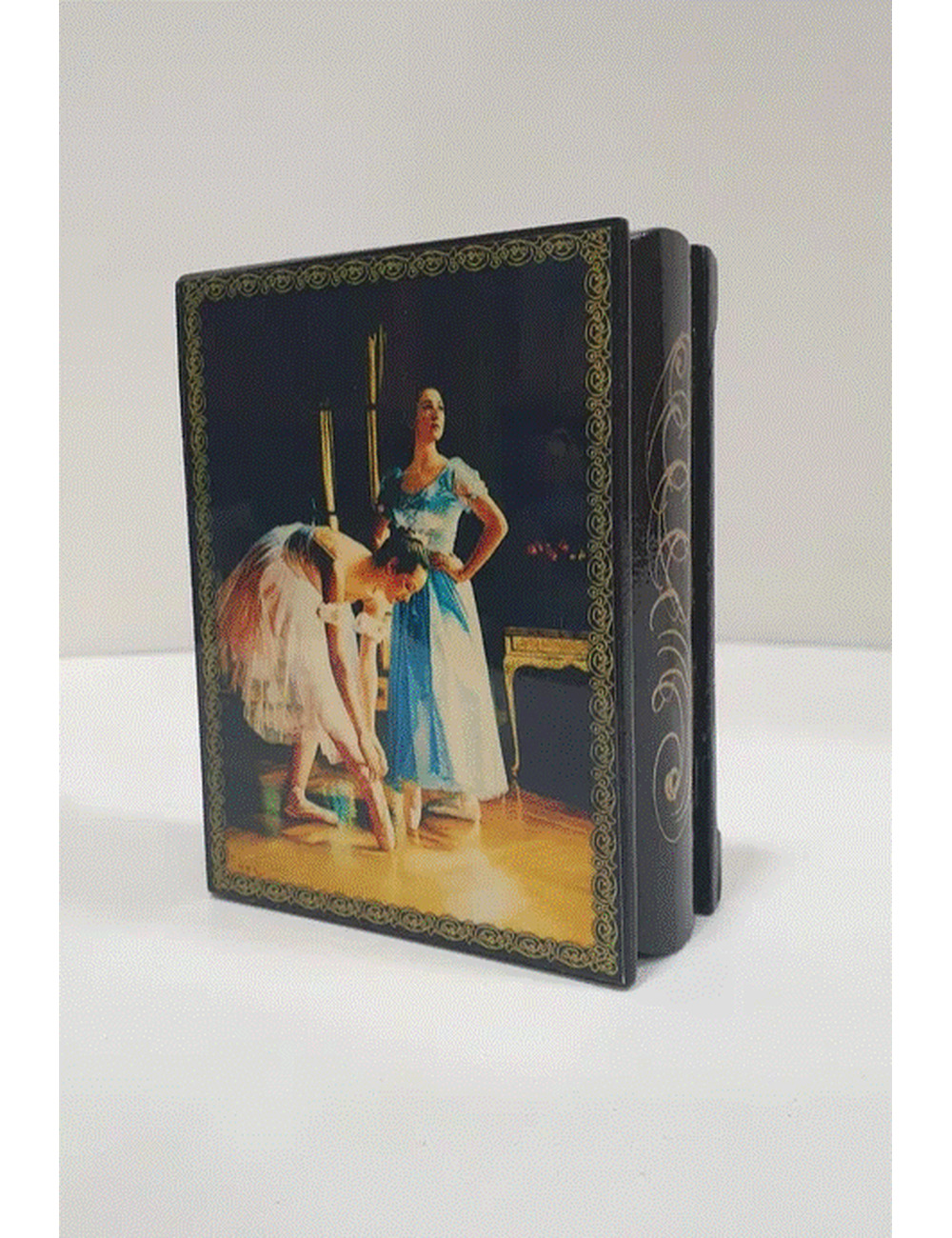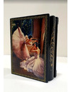 Шкатулка изготовлена по мотивам палехской росписи, сюжеты которой отражают повседневную жизнь, ситуации и героев произведений классиков.