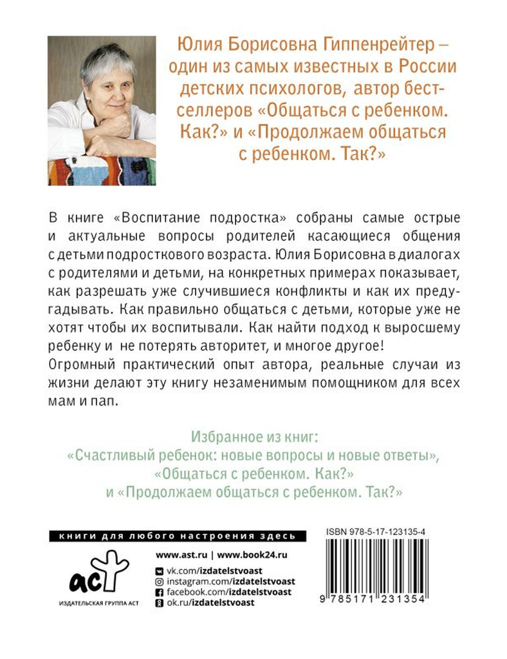 В книге «Воспитание подростка» собраны самые острые и актуальные вопросы родителей касающиеся общения с детьми подросткового возраста. Юлия Борисовна в диалогах с родителями и детьми, на конкретных примерах показывает, как разрешать уже случившиеся конфликты и как их предугадывать. Как правильно общаться с детьми, которые уже не хотят чтобы их воспитывали. Как найти подход к выросшему ребенку и не потерять авторитет, и многое другое!